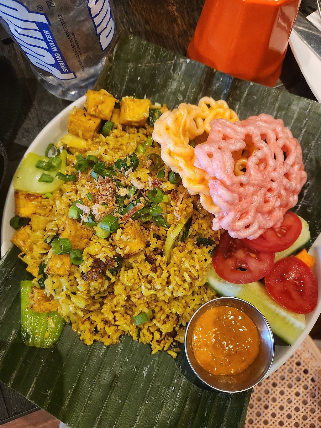 Smashed avo with cooked spinach and mushrooms; and the vegan nasi gore…