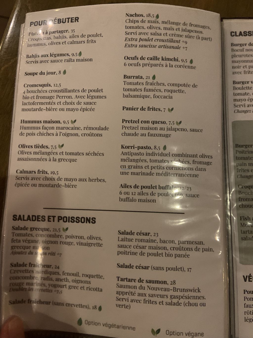I’ve had veggies cromesquis (aka fried balls) and a poutine with a sauce made of beer. It was really good, a bit spicy
