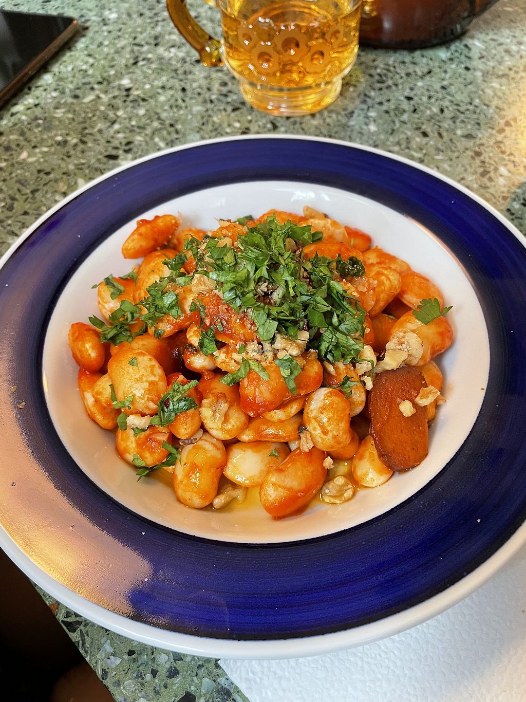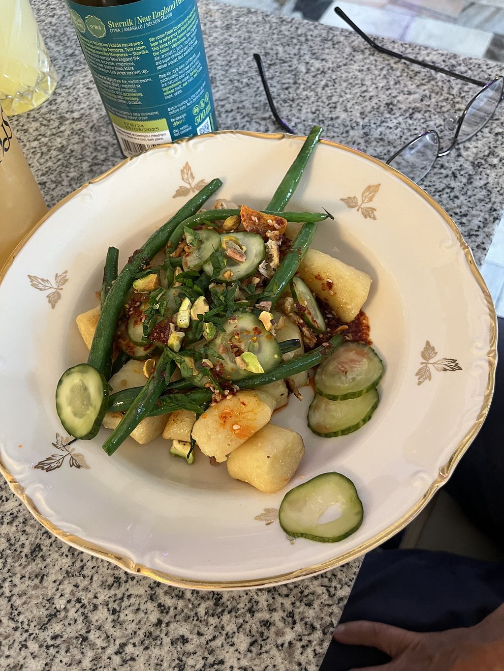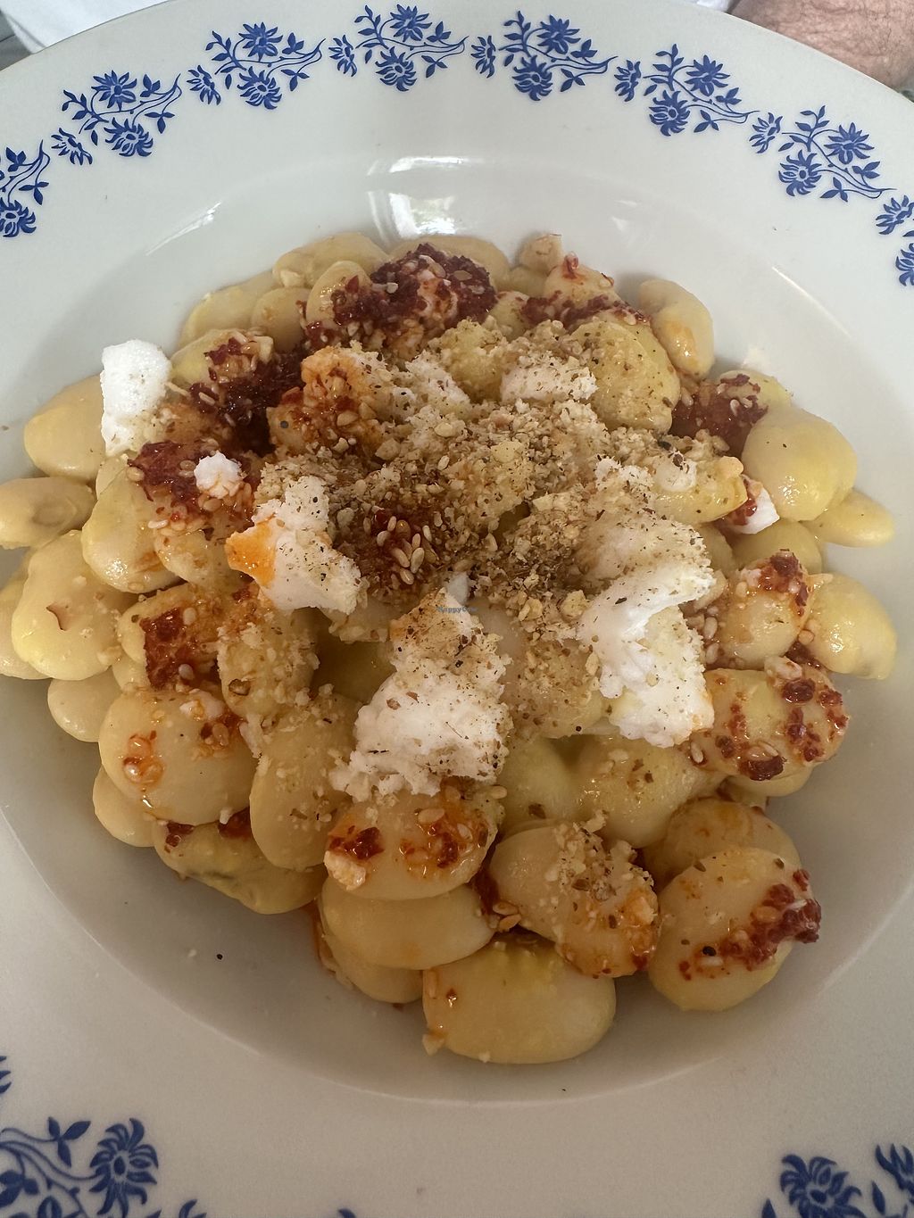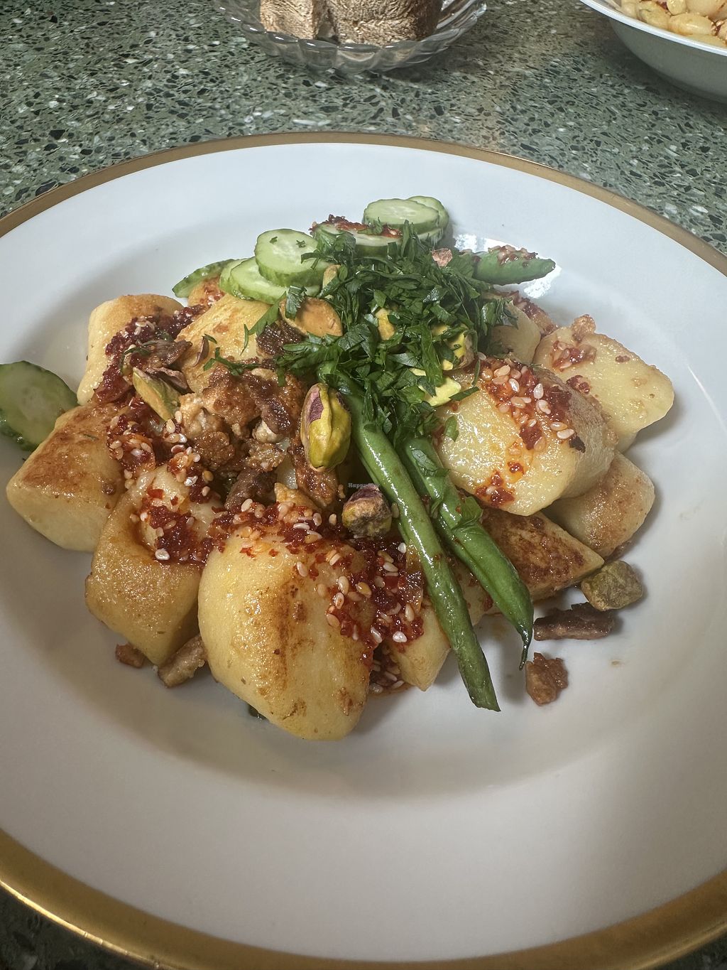 Wir hatten kleine Kartoffelklösse und weisse Riesenbohnen, beides schön scharf mit Chiliöl und auch sättigend. Der Cheeeecake war extrem köstlich, da waren wir schneller als das Foto…