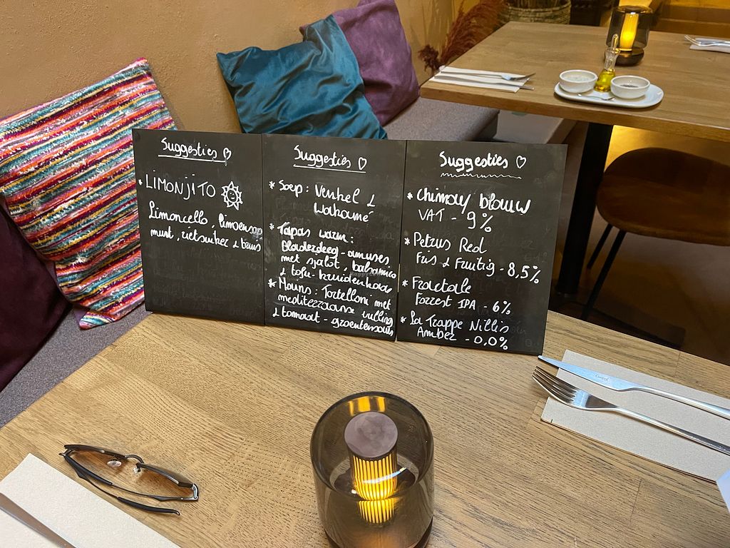 A very cozy vegan restaurant with a chic appearance. It didn't take long to find out that one of the waiters was Brazilian, which was quite a pleasant surprise for us. We then placed all our orders in Portuguese!!!!! As a hot starter ("Tapas warm") we chose the croquette ("Nomet kombu-kroketjes"), which was incredible and it is a very typical dish for Belgians. For main courses ("Hoofdgerechten") we ordered the "Pasta" and "Oesterzwamburger" dishes. The dishes were very tasty and in good quantity. The only downside was the price, which was quite steep, but the experience was incredible. We left very satisfied.