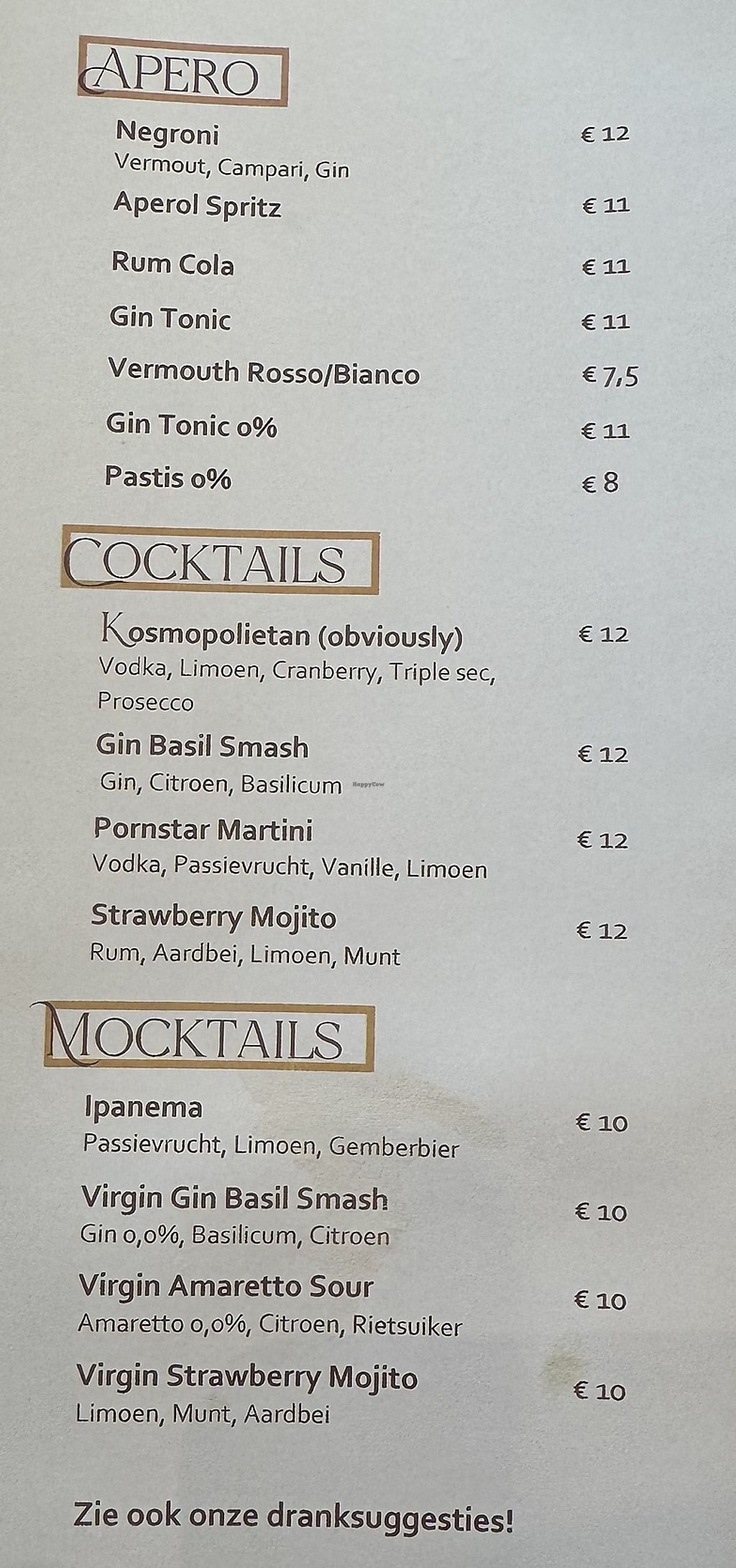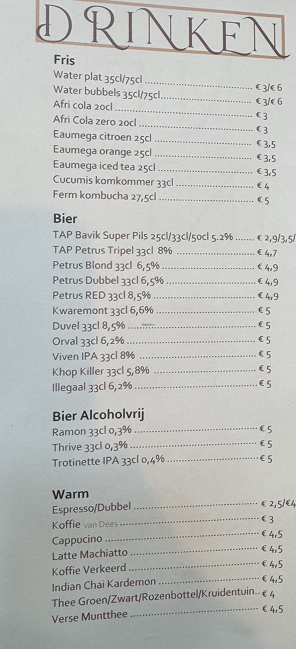 Est. Jan. 21, 2025. A restaurant/bar with a welcoming vibe situated in the historic heart of Bruges. Serves fancy drinks and veggie bites. Uses fresh produce in creative dishes. Confirmed all vegan May 2025. Open Wed 11:30-14:30, Wed-Sat 17:30-00:00, Fri 11:30-14:30. Closed Sun & Mon.