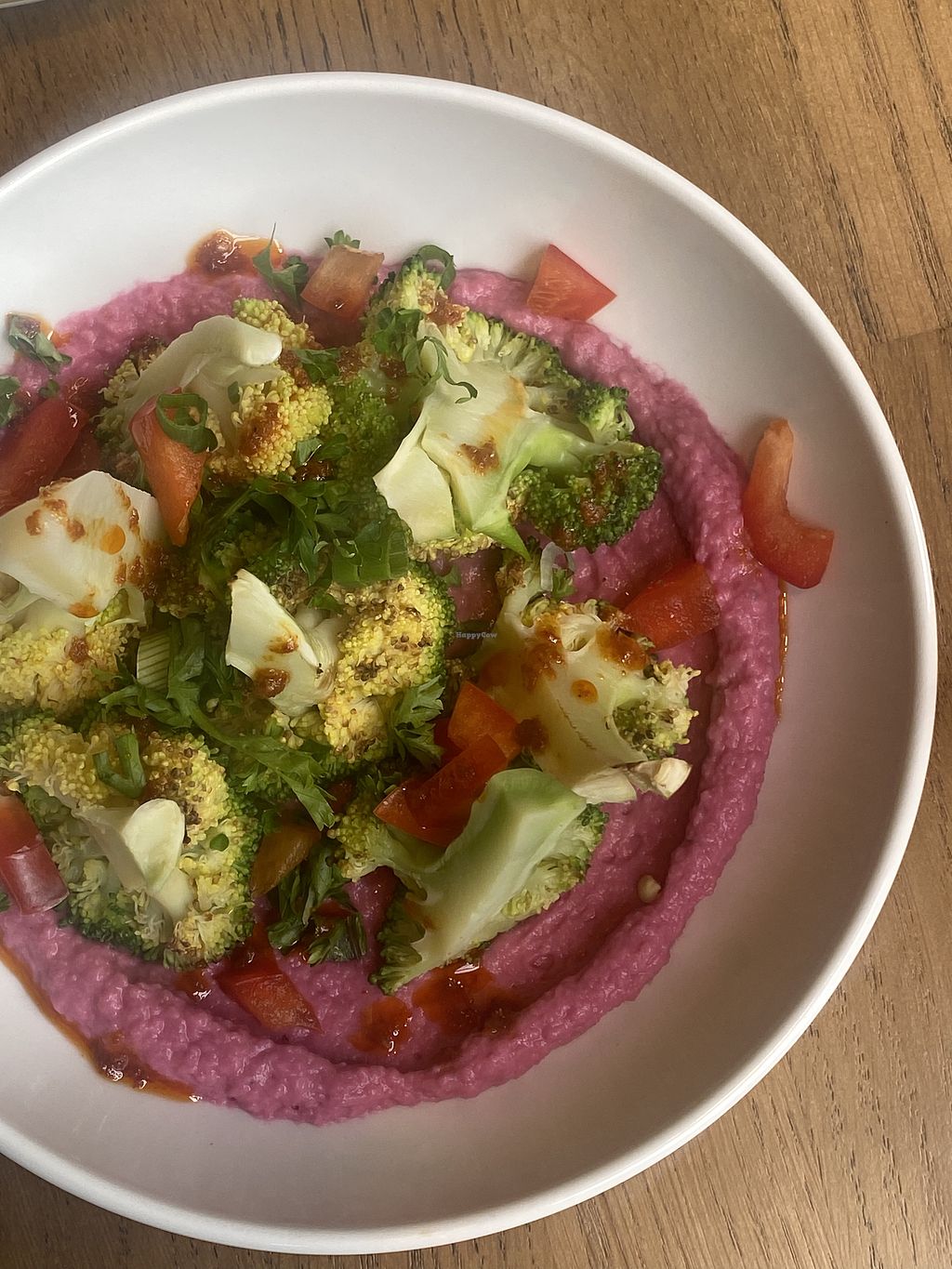 My friend ordered a Cosmopolitan, which felt very fitting given the name of the restaurant, and she really enjoyed it. For our starter, we shared the broccoli with red beet and lima bean hummus, topped with a South American spicy herb sauce. It was beautifully presented and full of flavor - a great start to the meal.