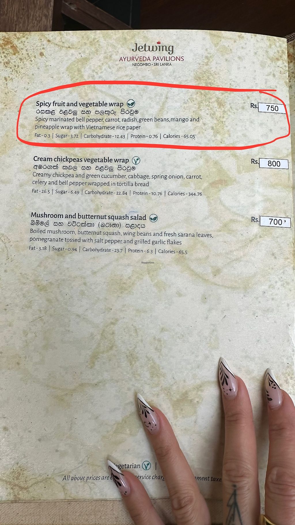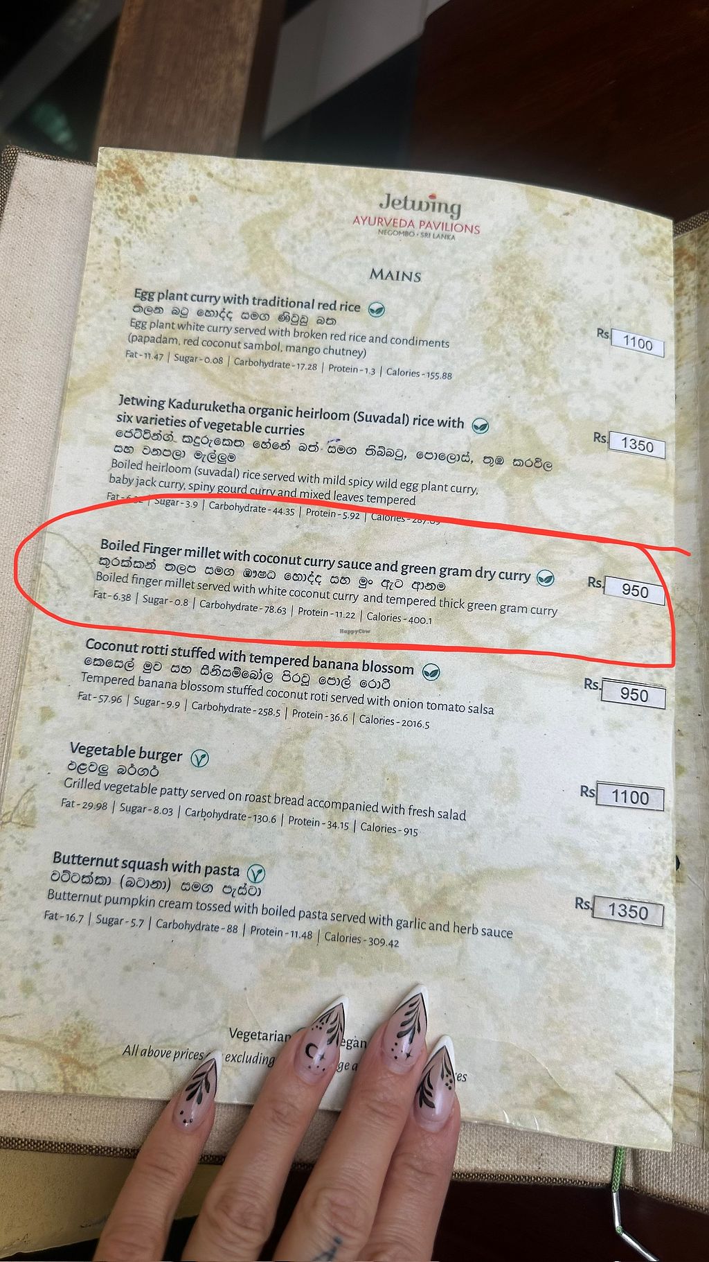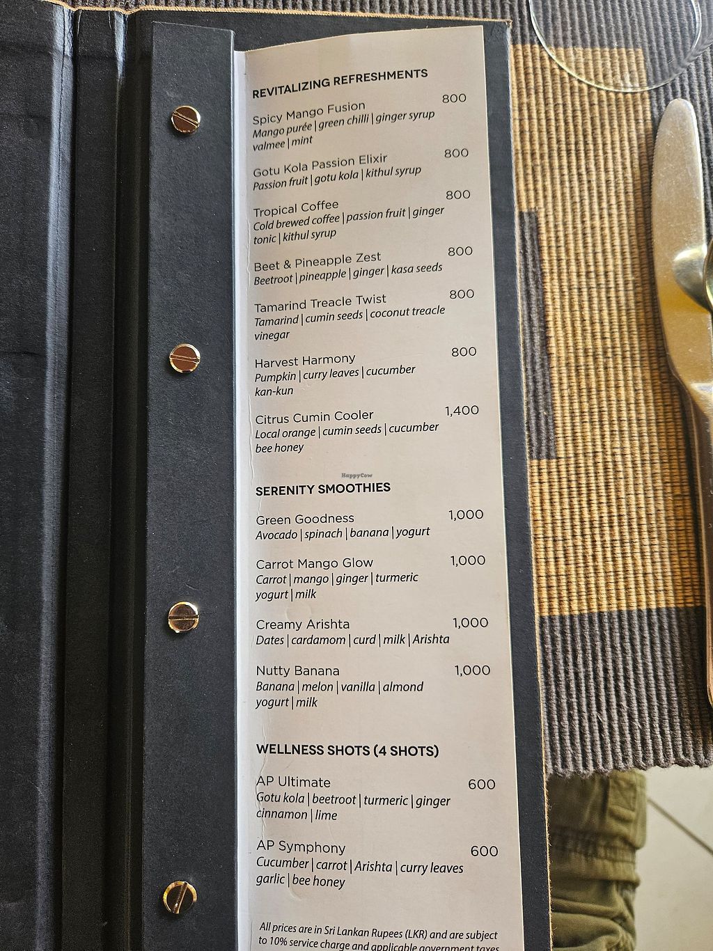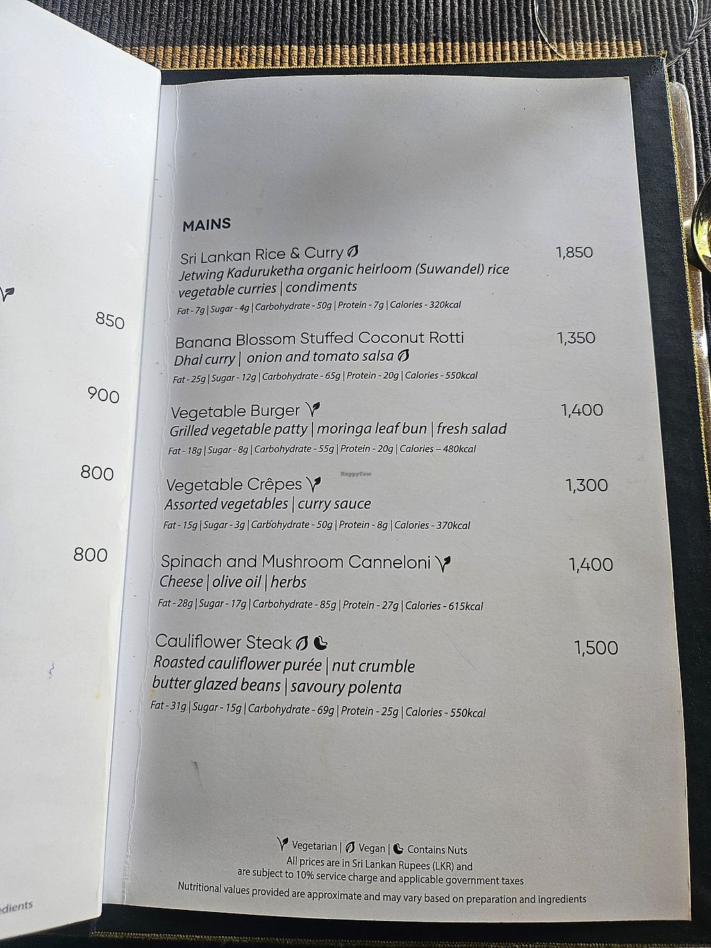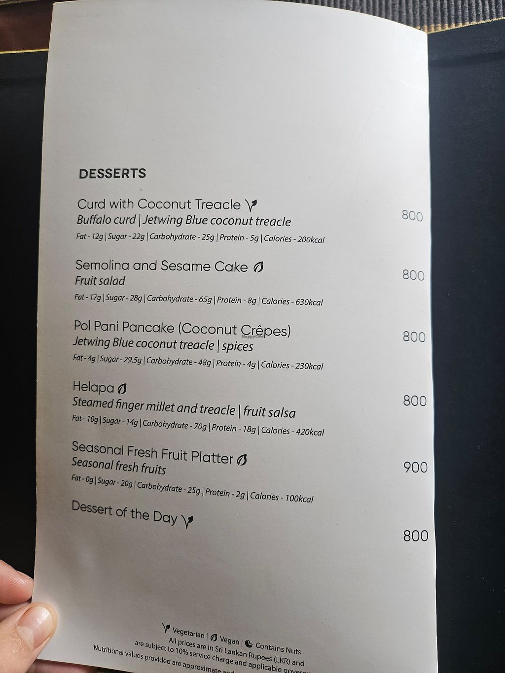 I had the iced tea and the rice with six curries. Location is beautiful und staff is great. Prices are quite high for Sri Lanka a service charge of 30% will be added. In total I paid around 2400 Rupees 200 tip (on top of service charge)