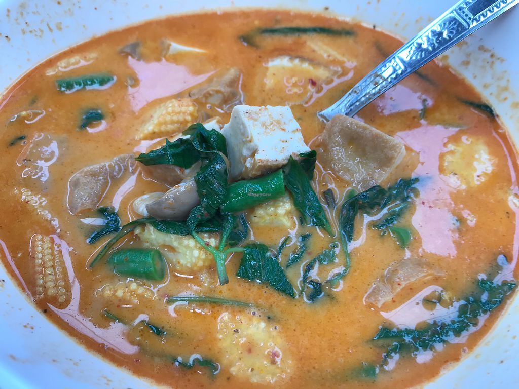 We found this place on HappyCow and went there. Finding the shop was not that hard although the name board doesn't say Kran Boom. It says Vegetarian Thai Food. We ordered the Thai Yellow Curry with a side of rice. The portion size was large and the food was very tasty. It is prepared fresh, hot to your order with the vegetables you pick.