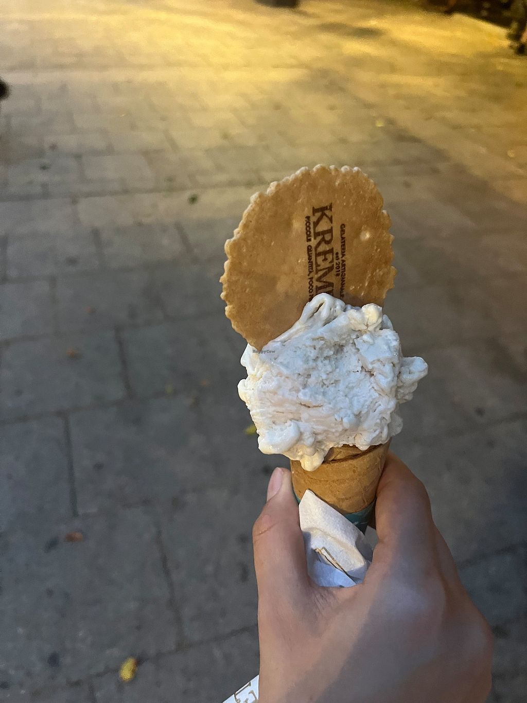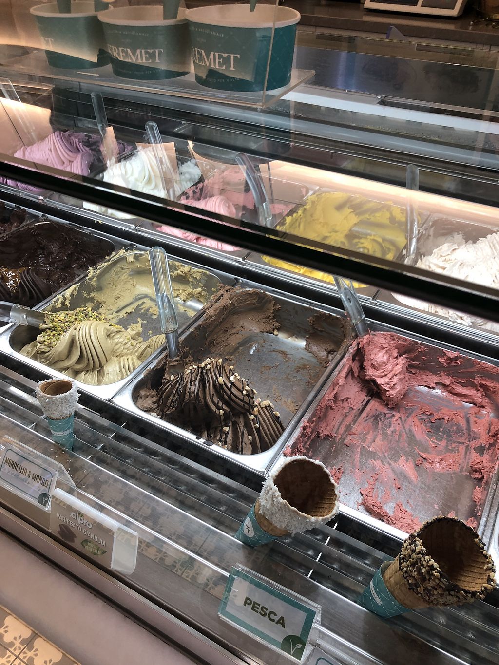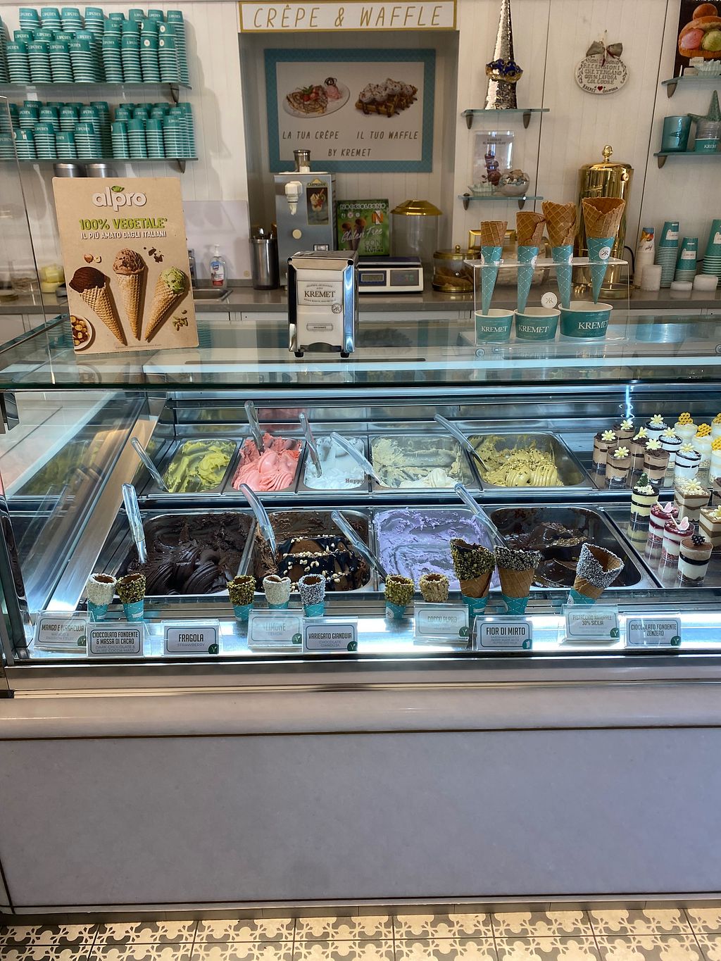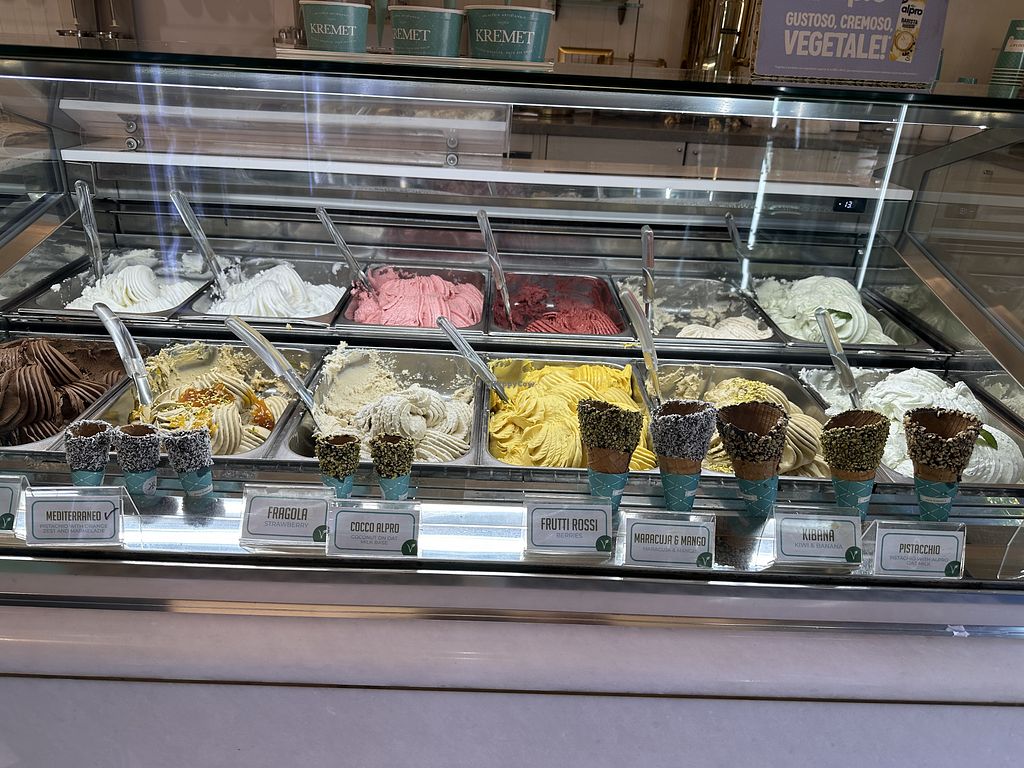 We visited Kremet twice. Great vegan pistachio! Sometimes they have other vegan options. On one day they had beside pistachio also vegan caramel. Always they had fruit icecream and dark chocolate. The waffle is always vegan.