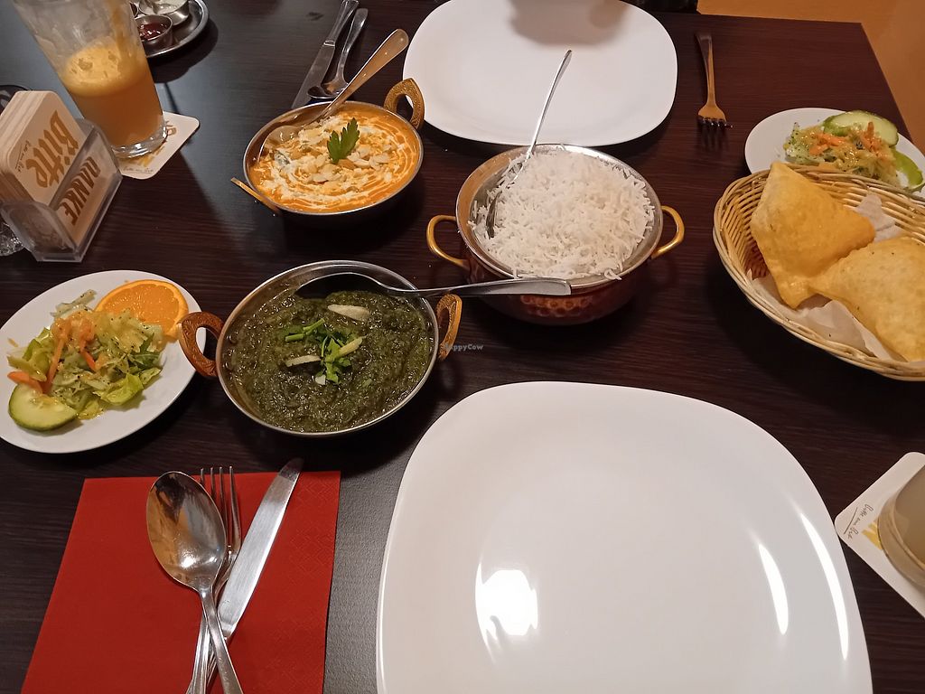 Serves meat, vegan options available. Traditional Indian restaurant with four labeled vegan options. Choices include aloo gobi, chana masala, and allo palak. Open Mon-Sun 11:00-22:00.