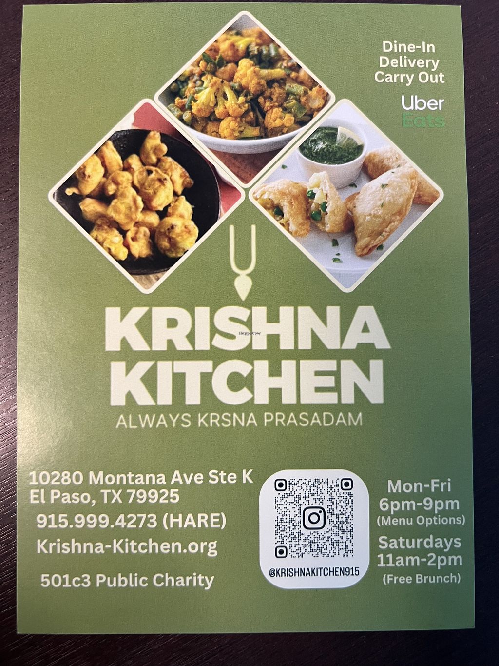 Fully vegan cafe serving Indian and some Mexican dishes. Serves free brunch on Saturdays from 11 am to 2 pm. Samosas, pakoras, kitchari, curries. (A public charity that distributes free vegan sanctified meals to the community. Raises funds by offering menu priced options.) Open Mon-Fri 6:00pm-9:00pm, Sat 11:00am-2:00pm. Closed Sun.