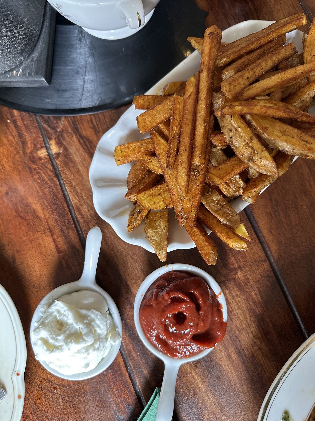 We had a 'fish'burger (actually fish fingers), a seitan burger, both with regular fries, with vegan mayo and joppie sauce, a piece of cake and cheese pie, fritz cola, 2 lemonades and a coffee for about 60€.