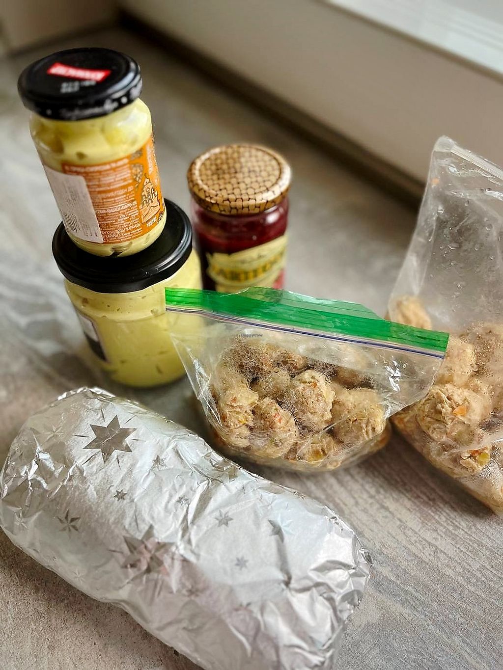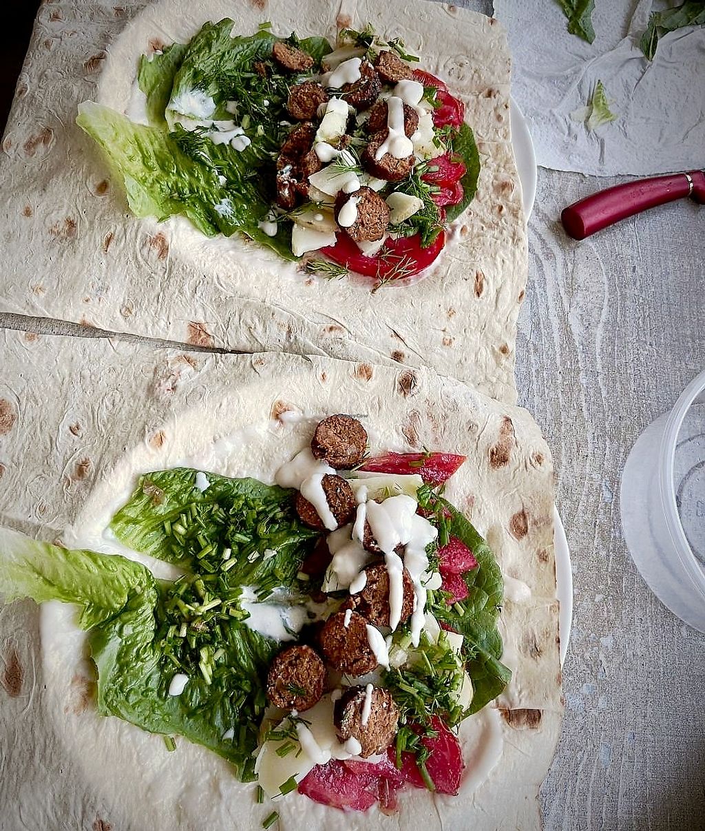 Making wraps with Kruzhok's fried vegan sausages, lettuce, tomatoes an…