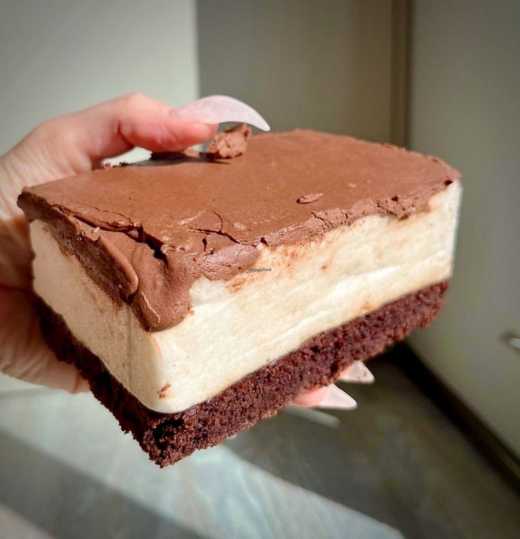Piece of vegan Bird's milk cake, the best one I've tried!