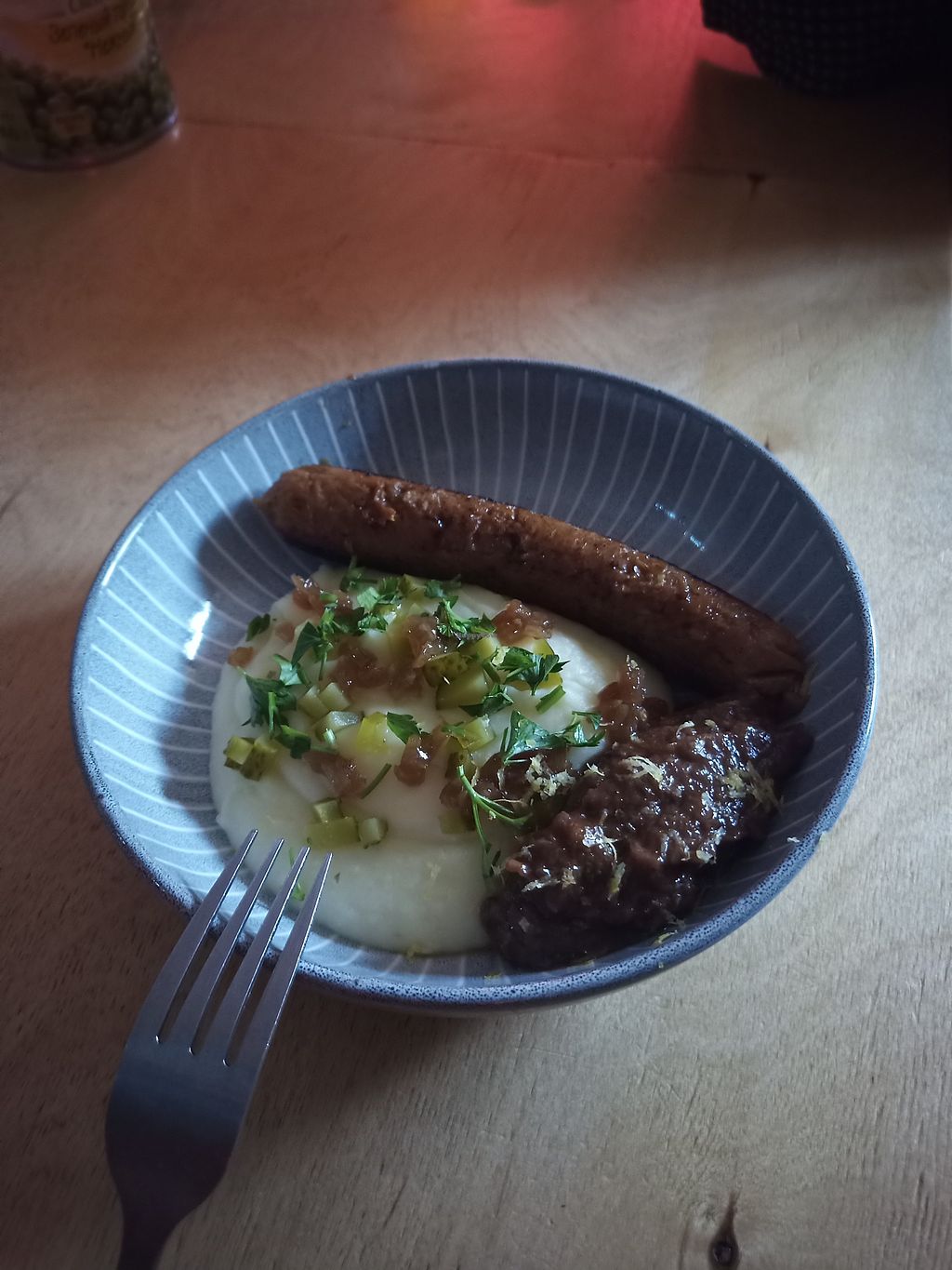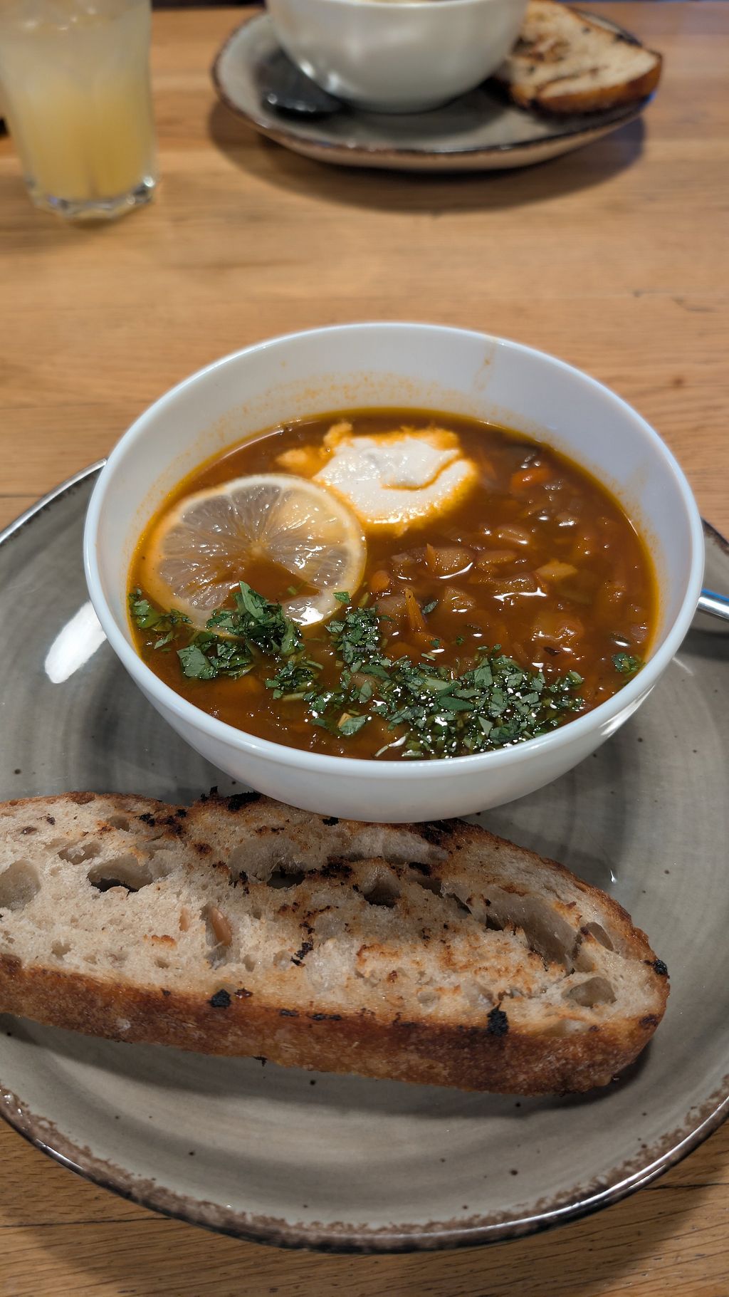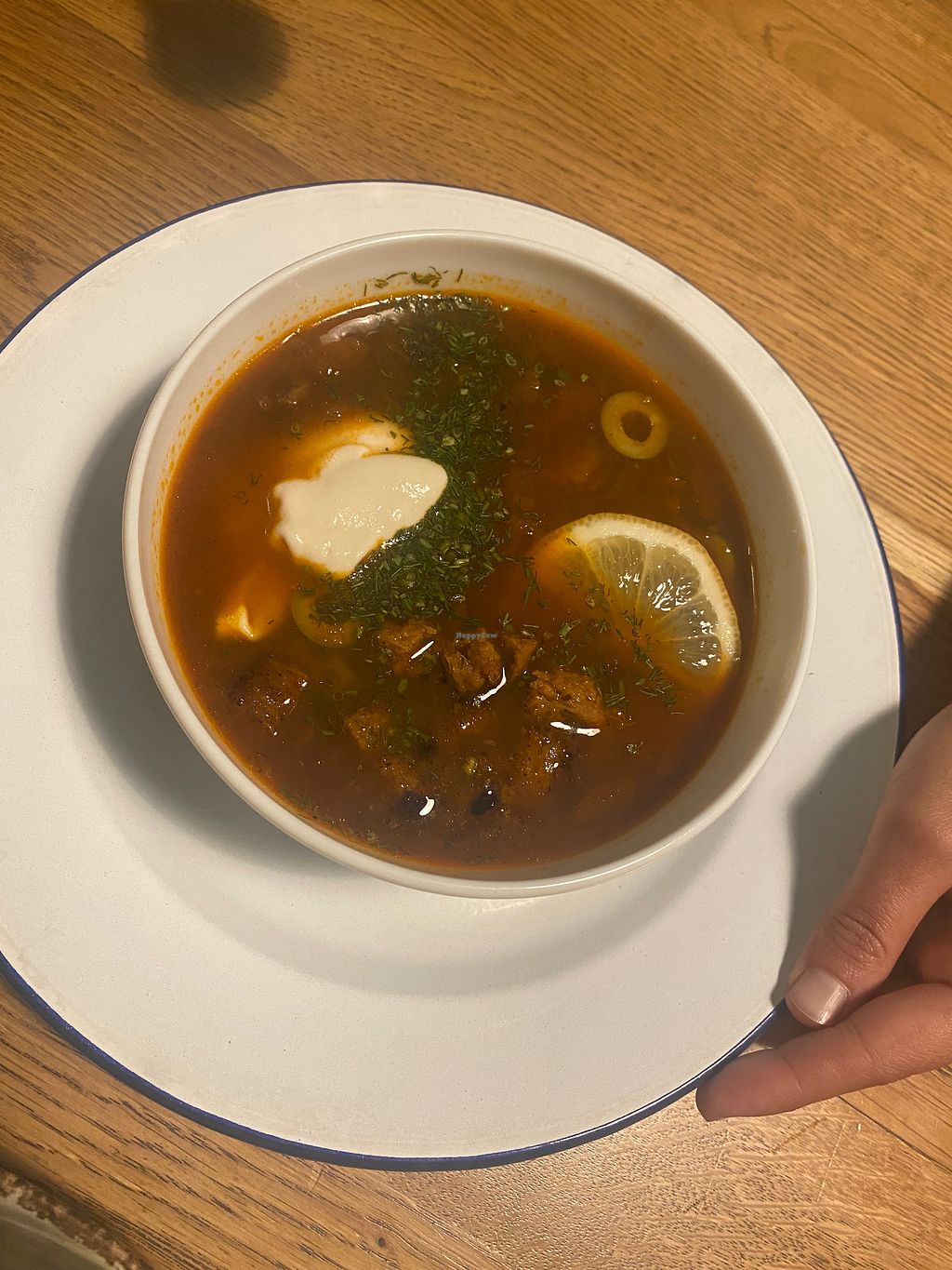 Solyanka: vegetable broth, potatoes, homemade sausages, pickled cucumb…