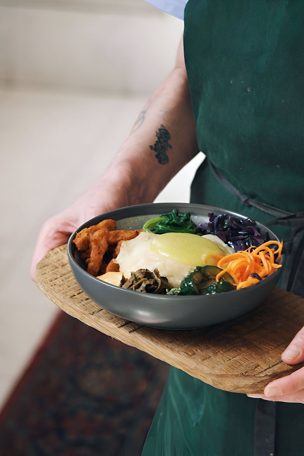 Bibimbap: non-egg, rice, morkovcha, kale, homemade kimchi, non-chicken…