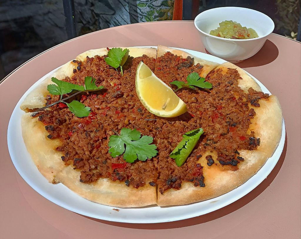 Lahmajo: soy mince, flatbread, bell pepper, mixed herbs, kimchi paste,…