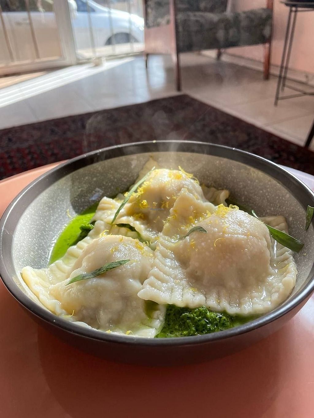 Ravioli: potatoes, spinach, champignons, cashew ricotta, chimichurri s…