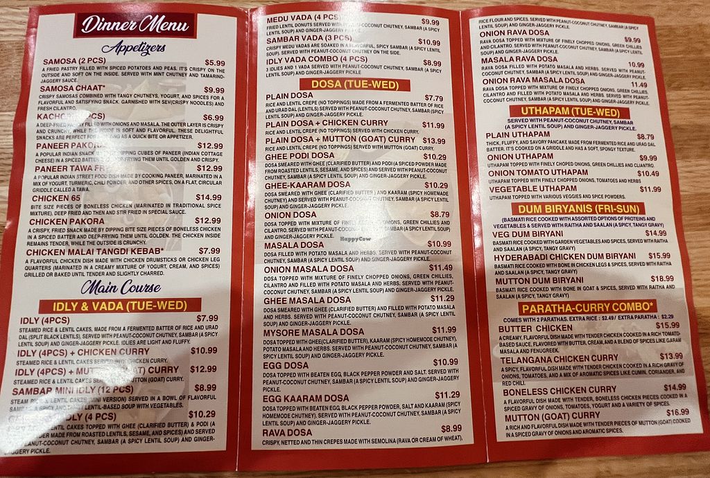 Serves meat, vegan options available. Indian restaurant offering vegan dishes such as dal, samosas, dosas, spinach dal, and masala dosa. Guests should confirm with the server as vegan items are not clearly labeled. Open Mon 5:00pm-9:00pm, Tue 11:00am-2:00am, Wed-Thu 5:00pm-9:00pm, Fri 11:00am-2:00pm, Sat-Sun 5:00pm-9:00pm. Closed Mon.