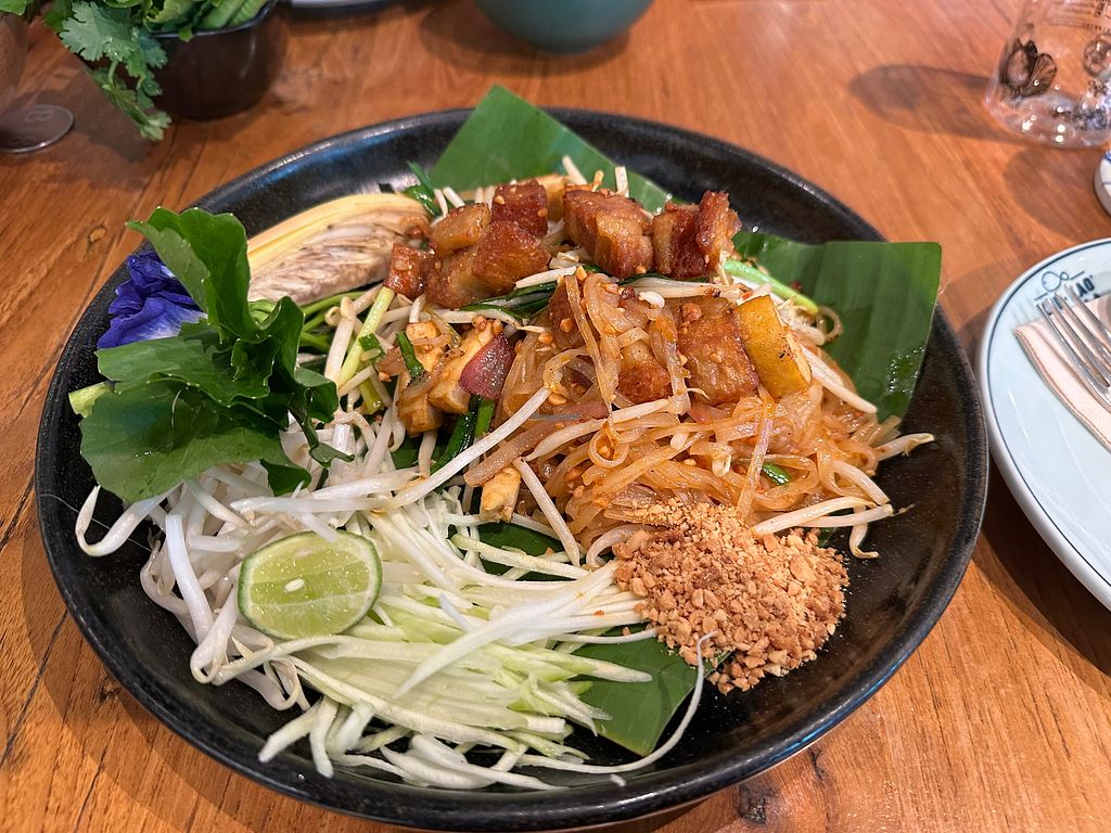 Serves meat, vegan options available. Thai restaurant located in The Promenade mall with a dedicated vegetarian menu page. Offers dishes with plant-based mock meat, including rice topped with stir-fried vegan crispy pork and Thai basil, pad thai with vegan crispy pork, and rice topped with stir-fried vegan crispy pork with salt and chili. Some other dishes might also be vegan; best to confirm. Open Mon-Sun 10:00am-10:00pm.