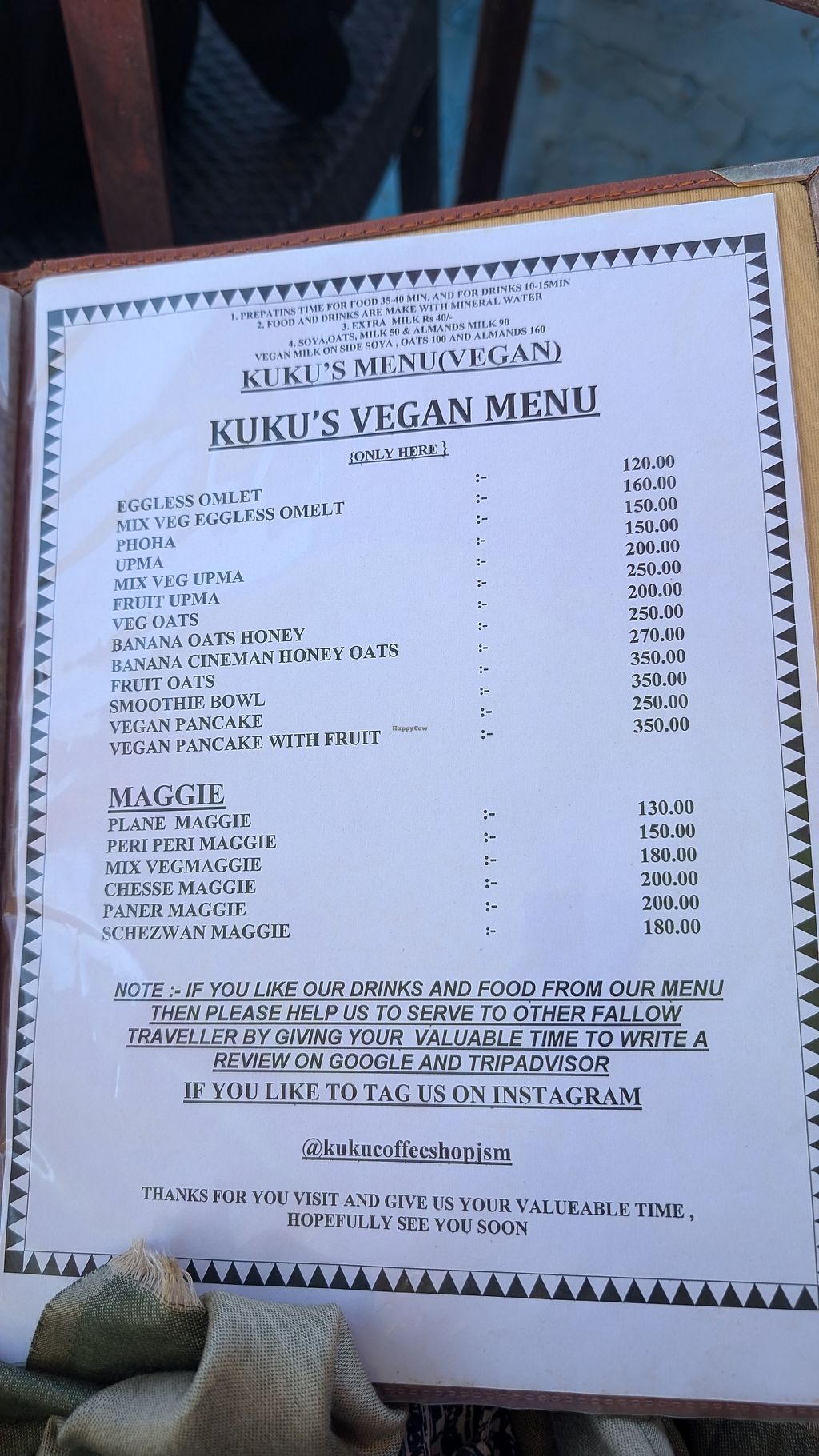Kuku have lovely staff who are welcoming and understand what vegan is. The cafe doesn’t really do dinner food but have coffee that is as close to western coffee as you can find in India and good snack food. We’ve had banana oatmeal (not on menu), the vegan omelette, noodles, toast and fries. All have been good. Definitely worth a visit if you are in Jaisalmer - it also has a good view.