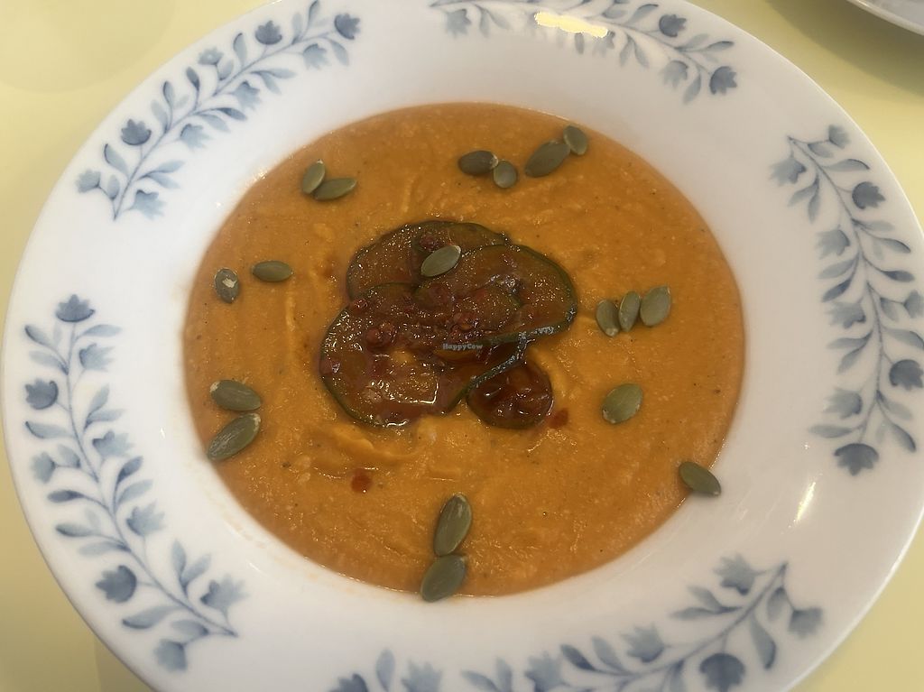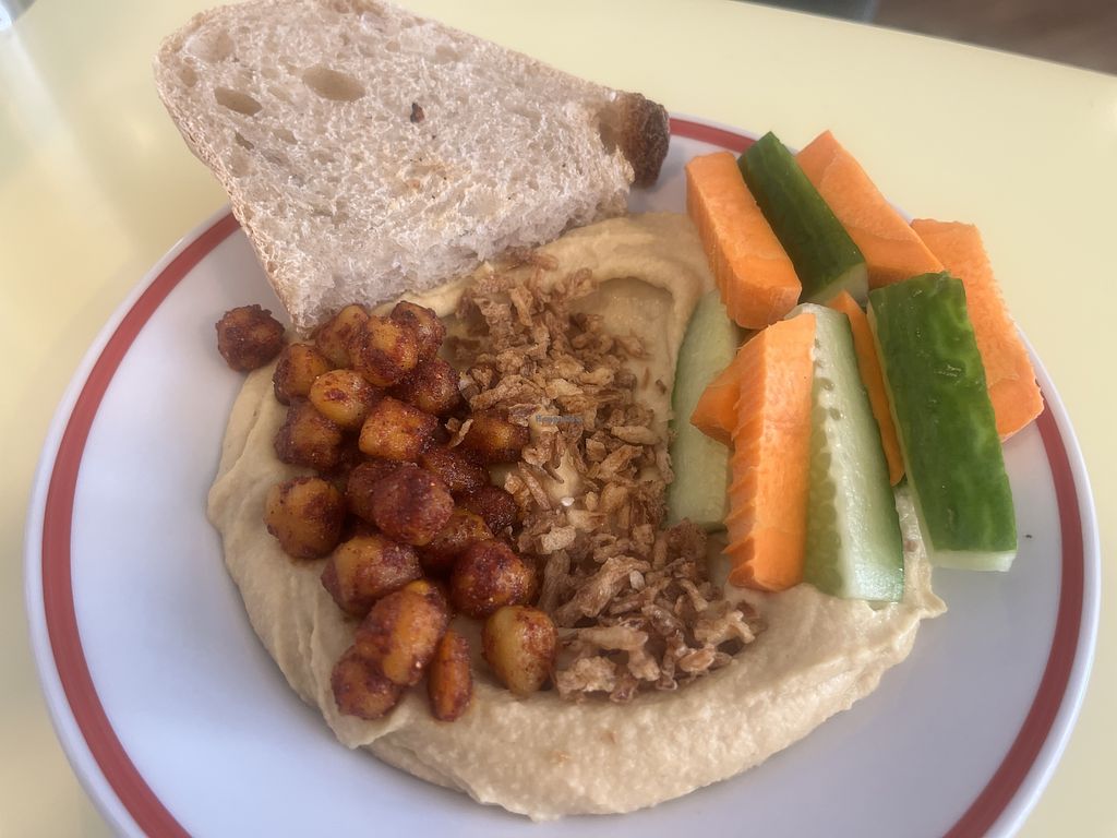For lunch enjoyed completely plant based cream of lentil soup topped with kimchi pickles which came with whipped tofu spread and toast. Didn’t know about that as had ordered order of hummus with carrots and cucumber and piece of toasted bread. All freshly prepared and SO tasty! Good portions and great value!