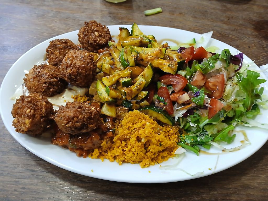 Es gibt viele vegane Optionen - verschiedene Variationen mit Falafel oder Kumpir. Schnell, lecker, günstig und auch zu späterer Srunde offen.