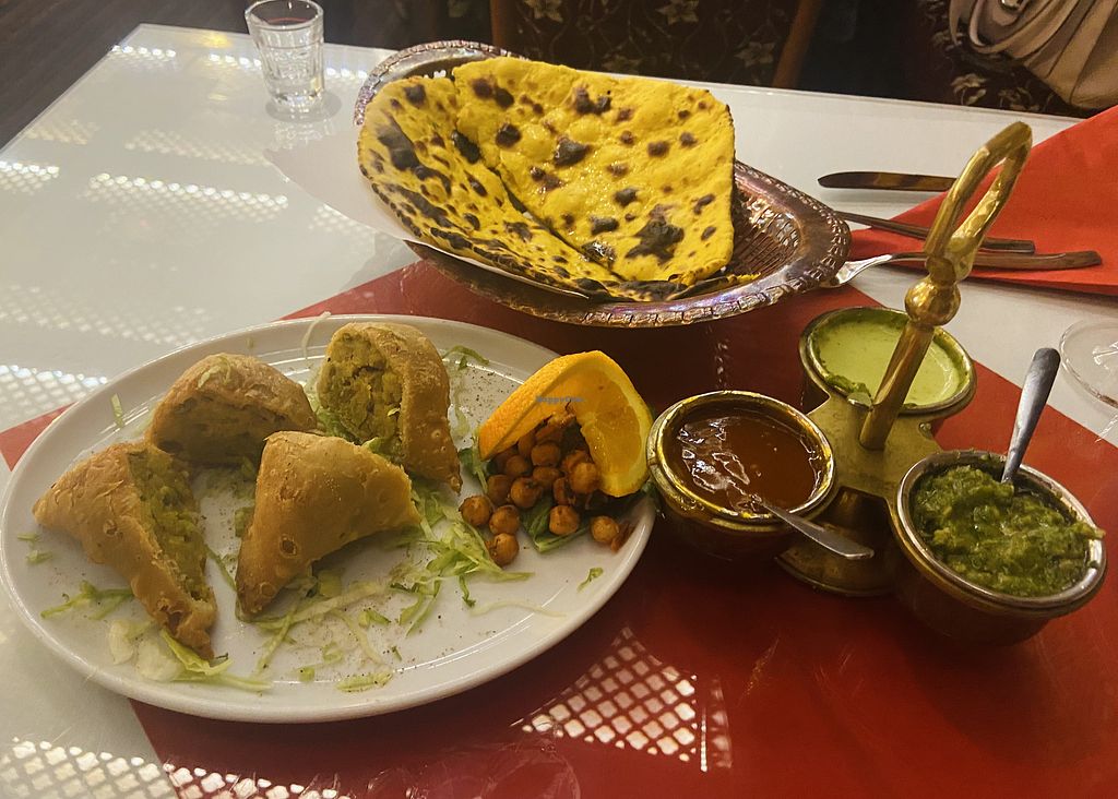 Samosas and naan. The green spicy sauce for samosas is so good, I orde…