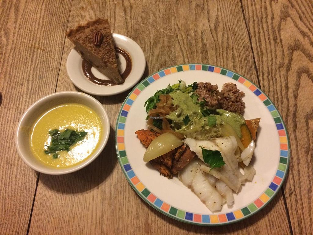 Friday night dinner with soup and dessert! Organic and vegan (fish ava…