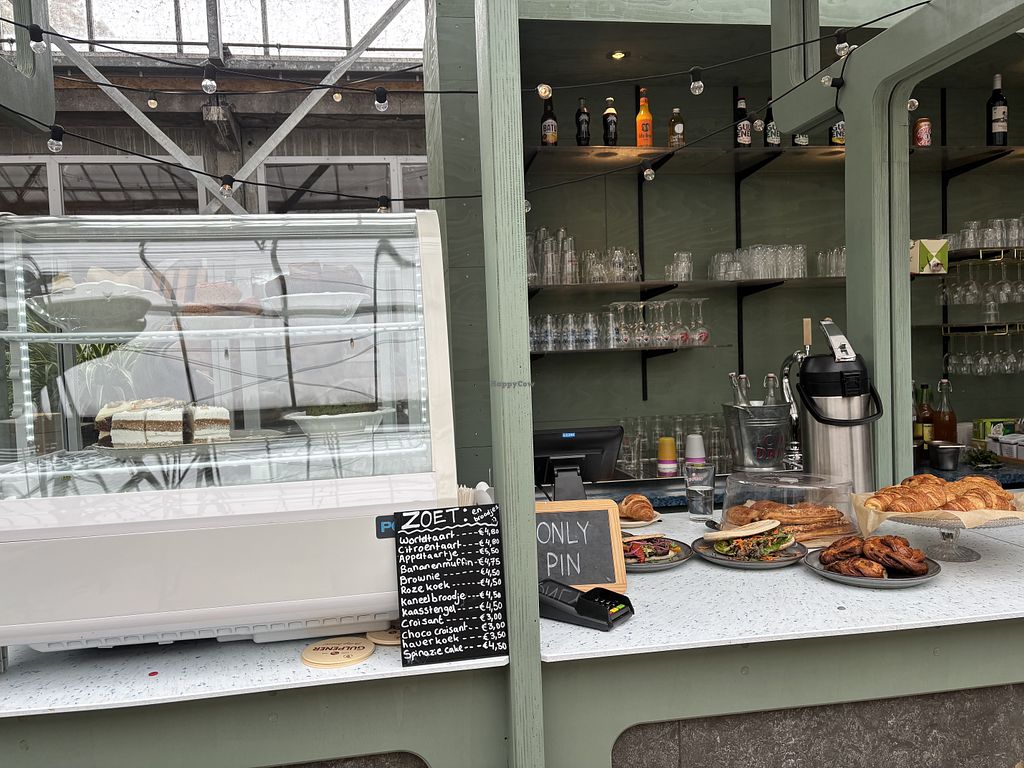 Offers multiple vegan food, such as soup, sandwiches, snacks (bitterballen, hurray!) and cakes. Always good food. Good coffee. Great place