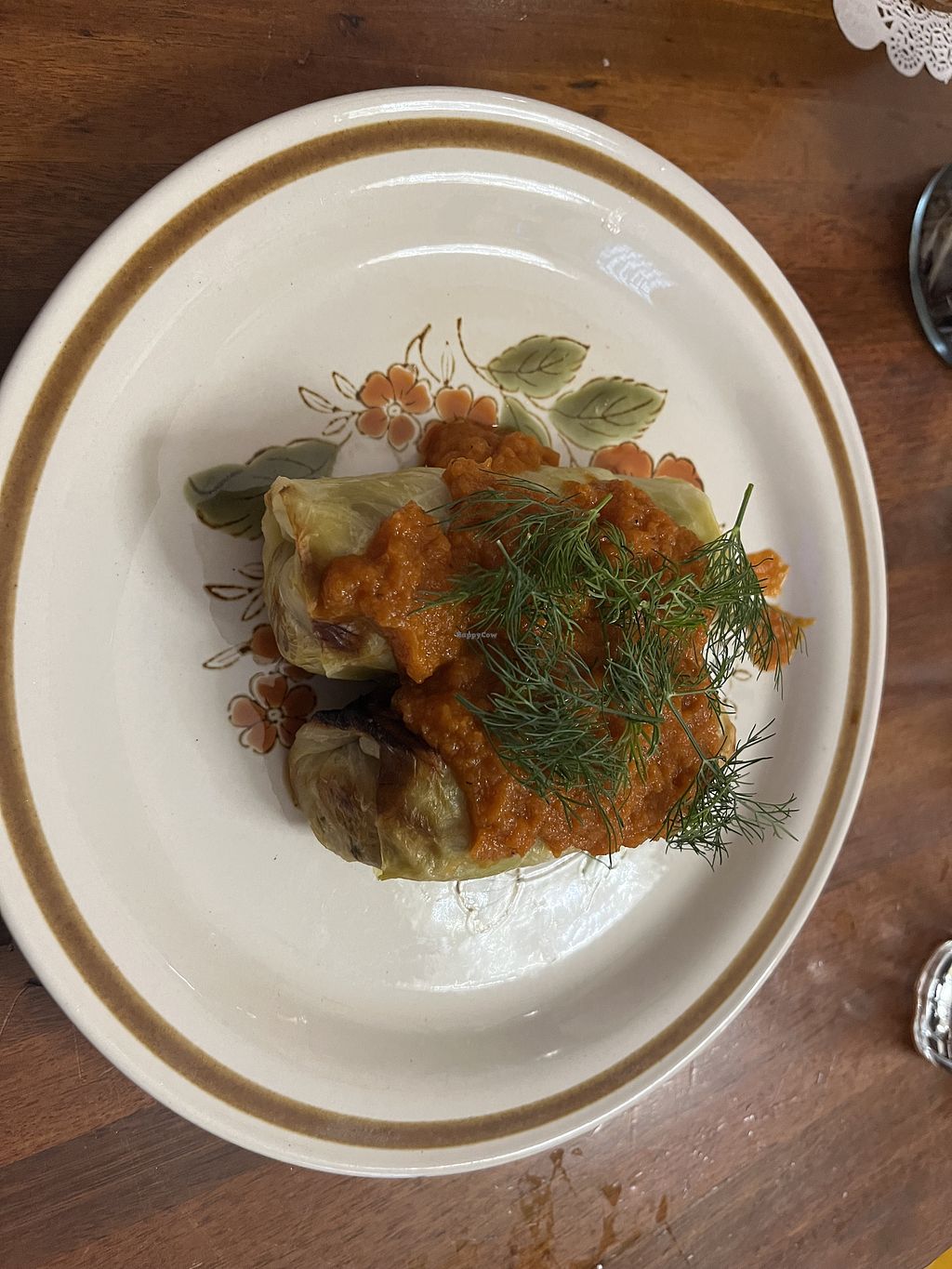 We got 3 starters borscht, cabbage rolls and mushroom dumplings first they brought us non vegan even though we clearly said vegan they seem confused with vegetarian and vegan, portions were so small 2 dumplings 2 rolls small soup it was very expensive we said yes to water at the start thinking it’s complimentary and got charged $10, if they ask if you want water say no if your on a budget otherwise food was tasty but we were hungry could not afford more got LOTF on way home.