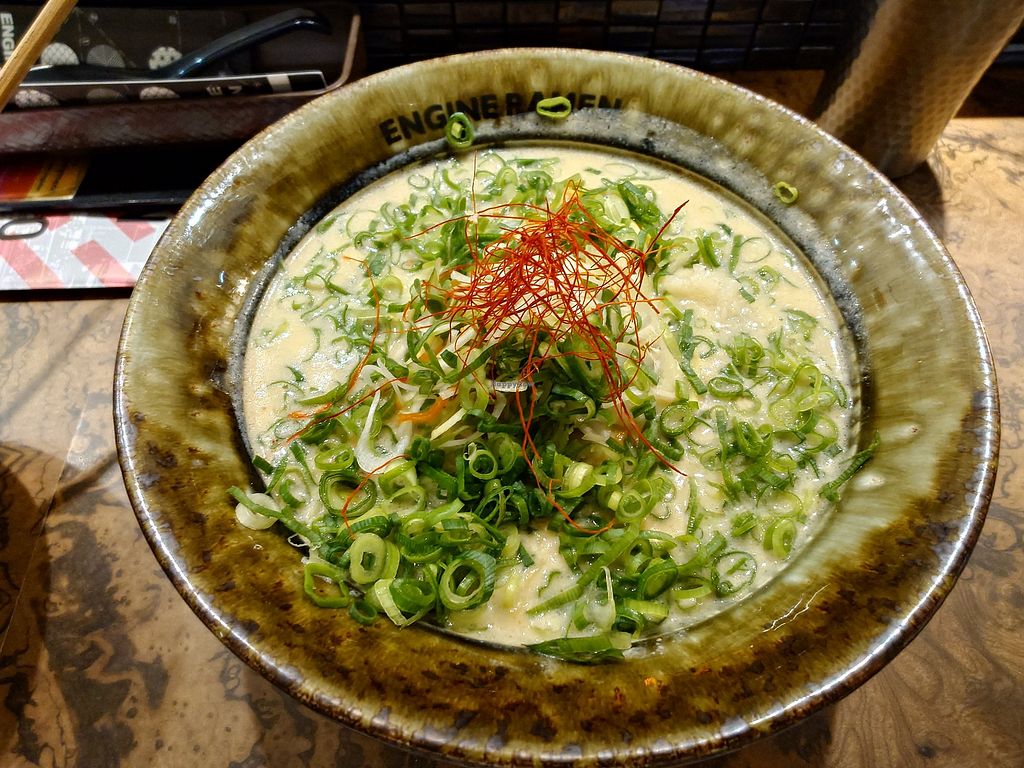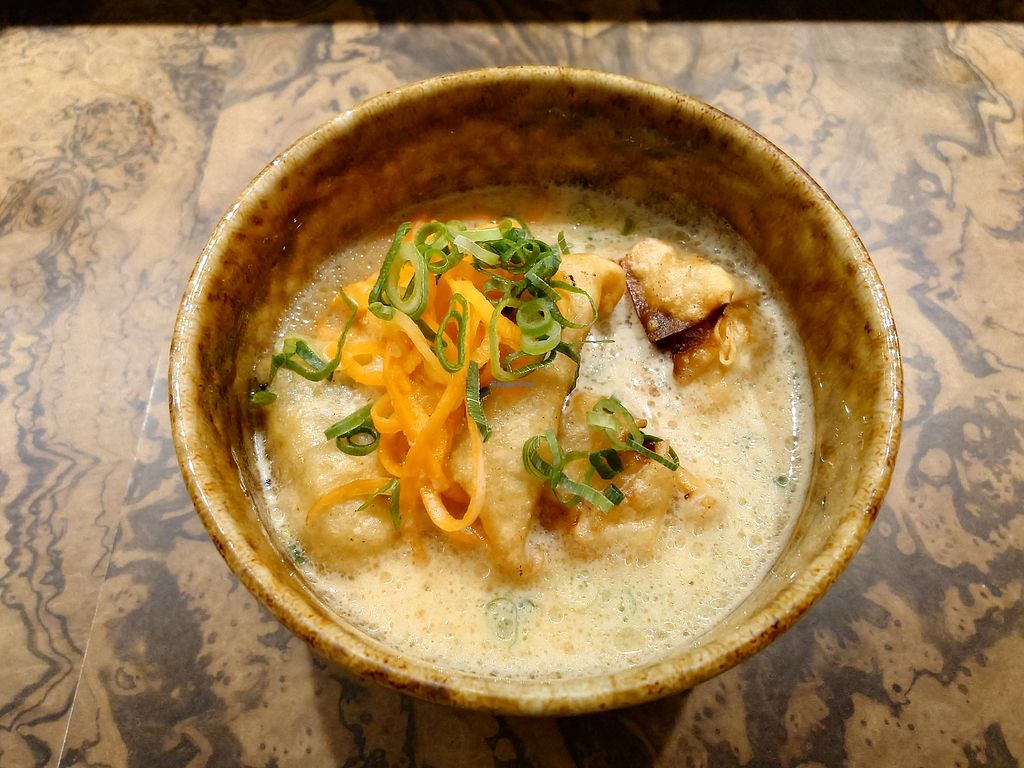 Serves meat, vegan options available. Modern style ramen restaurant offering vegetarian and vegan options which are labeled on the menu. Has two vegan ramen: soy ramen and zesty spicy ramen. Gluten-free soybean noodle and konjac noodles are available. Buy a ticket for the dishes you'd like: the vending machine accepts big notes. English spoken. Est. 2018. Relocated from Daizucho 400 2F, Shimogyo Ward. Gets very biusy and queues can be long. Open Mon-Sun 12:00pm-10:00pm. Closed Tue-Wed. Last order 30 minutes before closing.