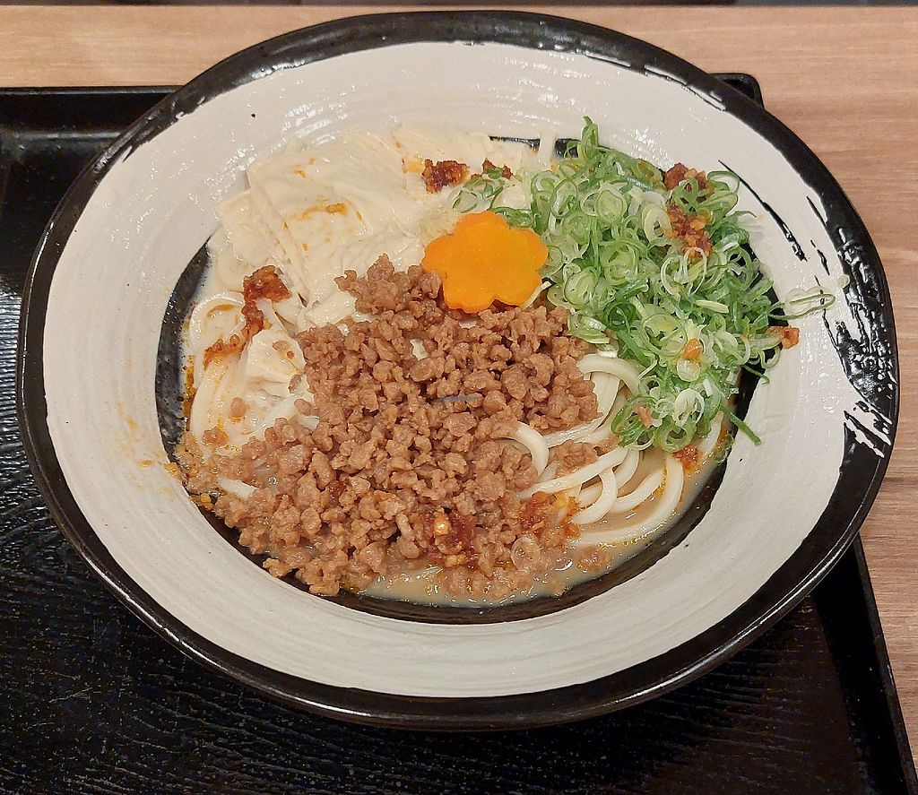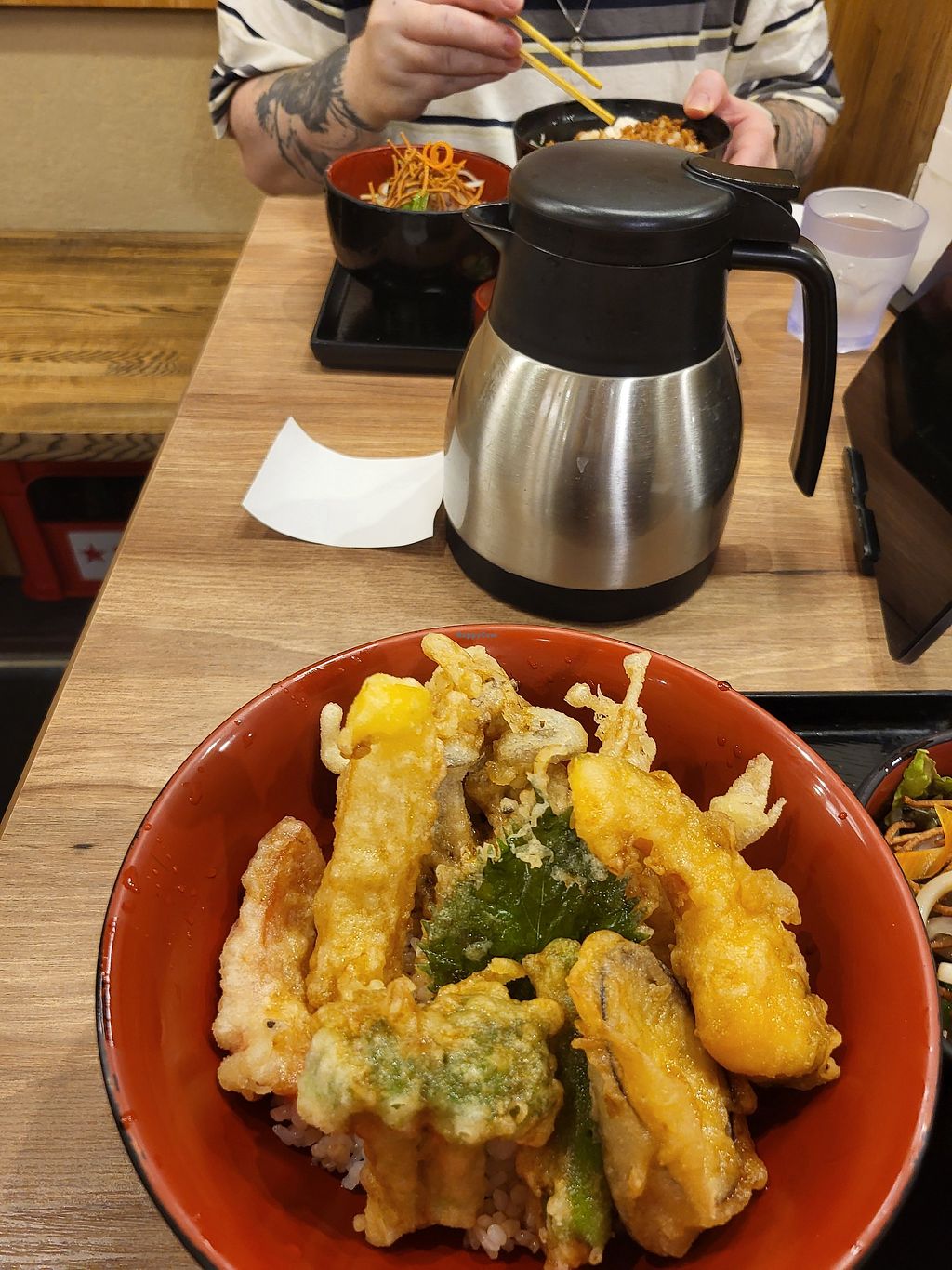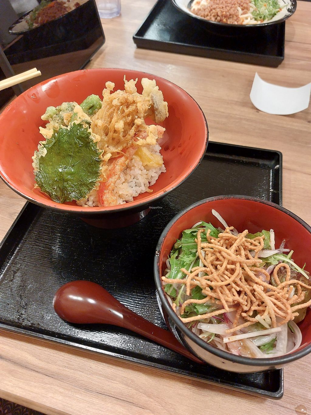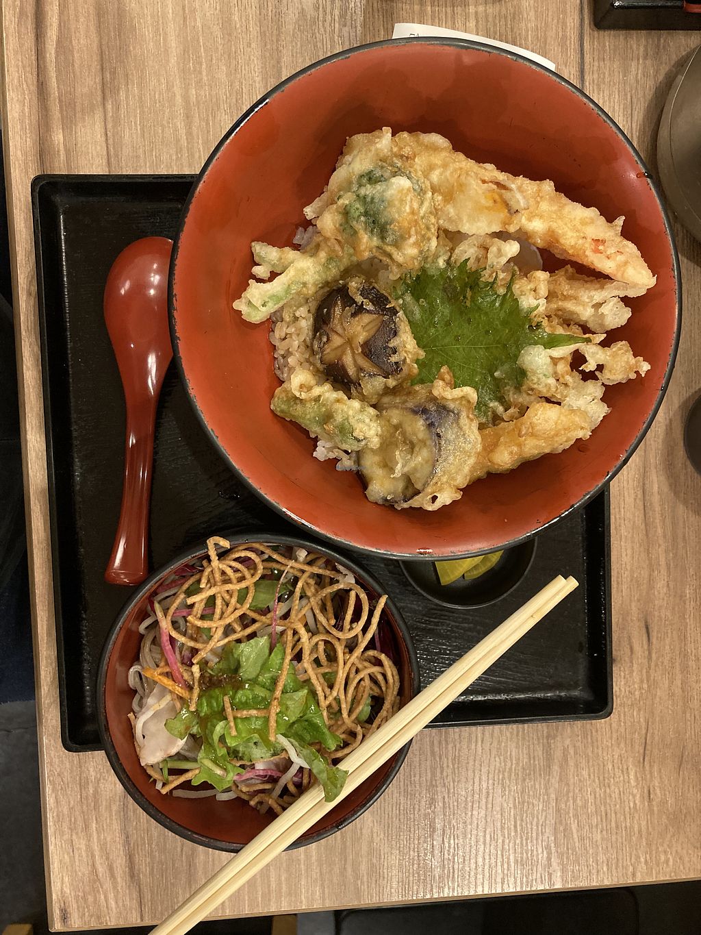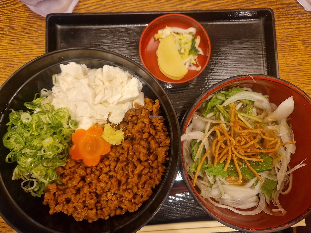 Reis, Tofu und Tofu-Hackfleisch. Rechts Salat mit Soba-Spaghetti