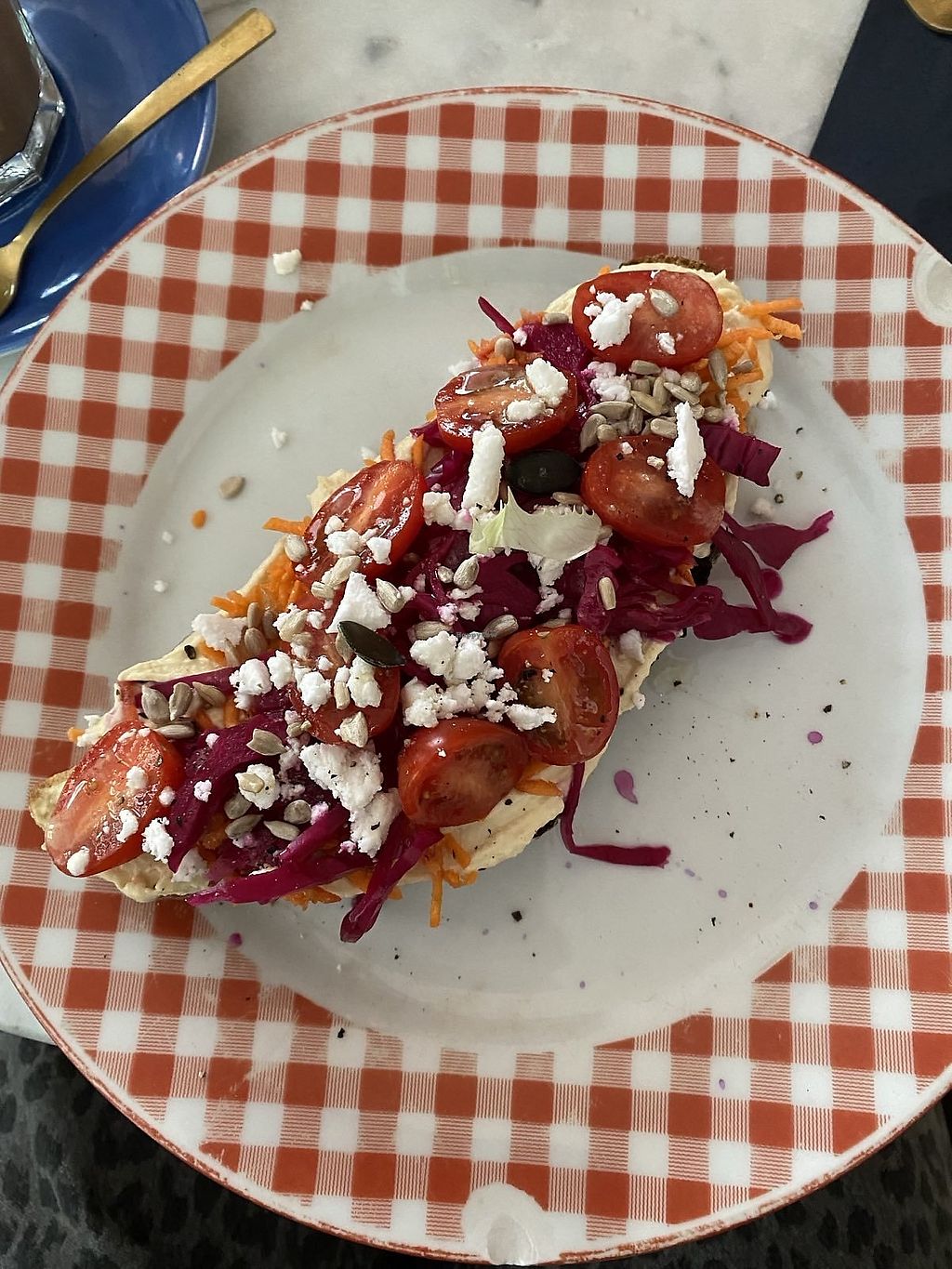 We had the blueberry pancakes and hummus/red cabbage/tomato toast