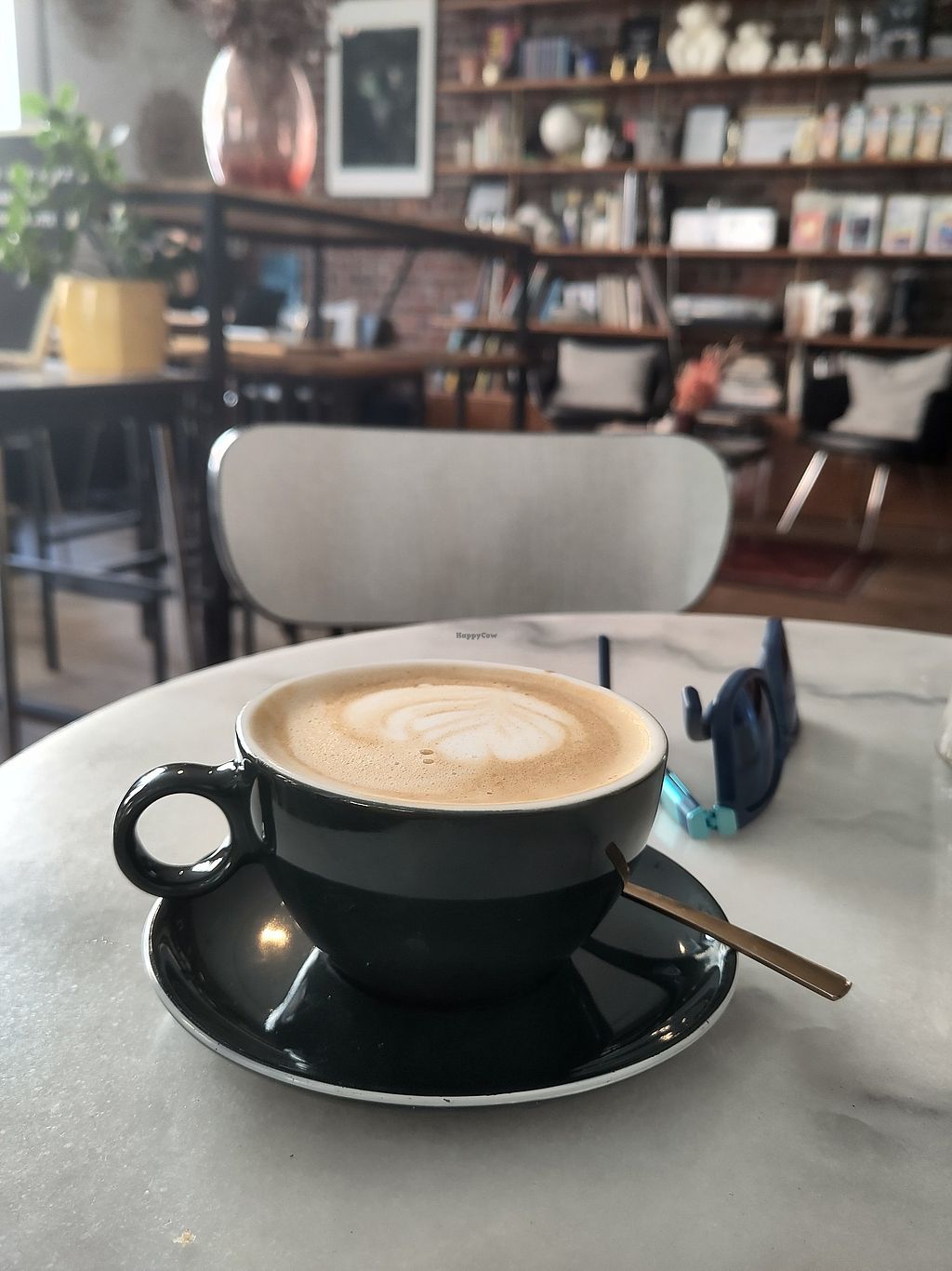 I loved this cafe, it’s all vegan and their toasted banana bread with peanut butter was bomb. I also tried a pumpkin spice chai tea which was delicious. They have super good music, not too loud, and lots of plugs below the seats to charge your phone or laptop. Friendly staff :)