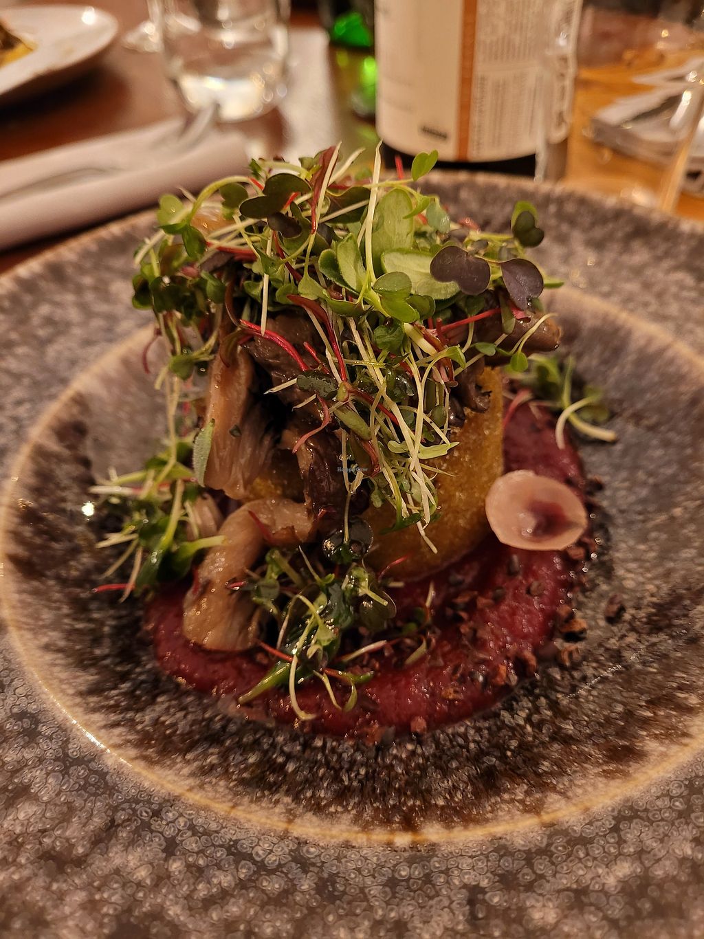 Rôti de seitan avec purée de pommes de terre à l'huile de truffes, ple…