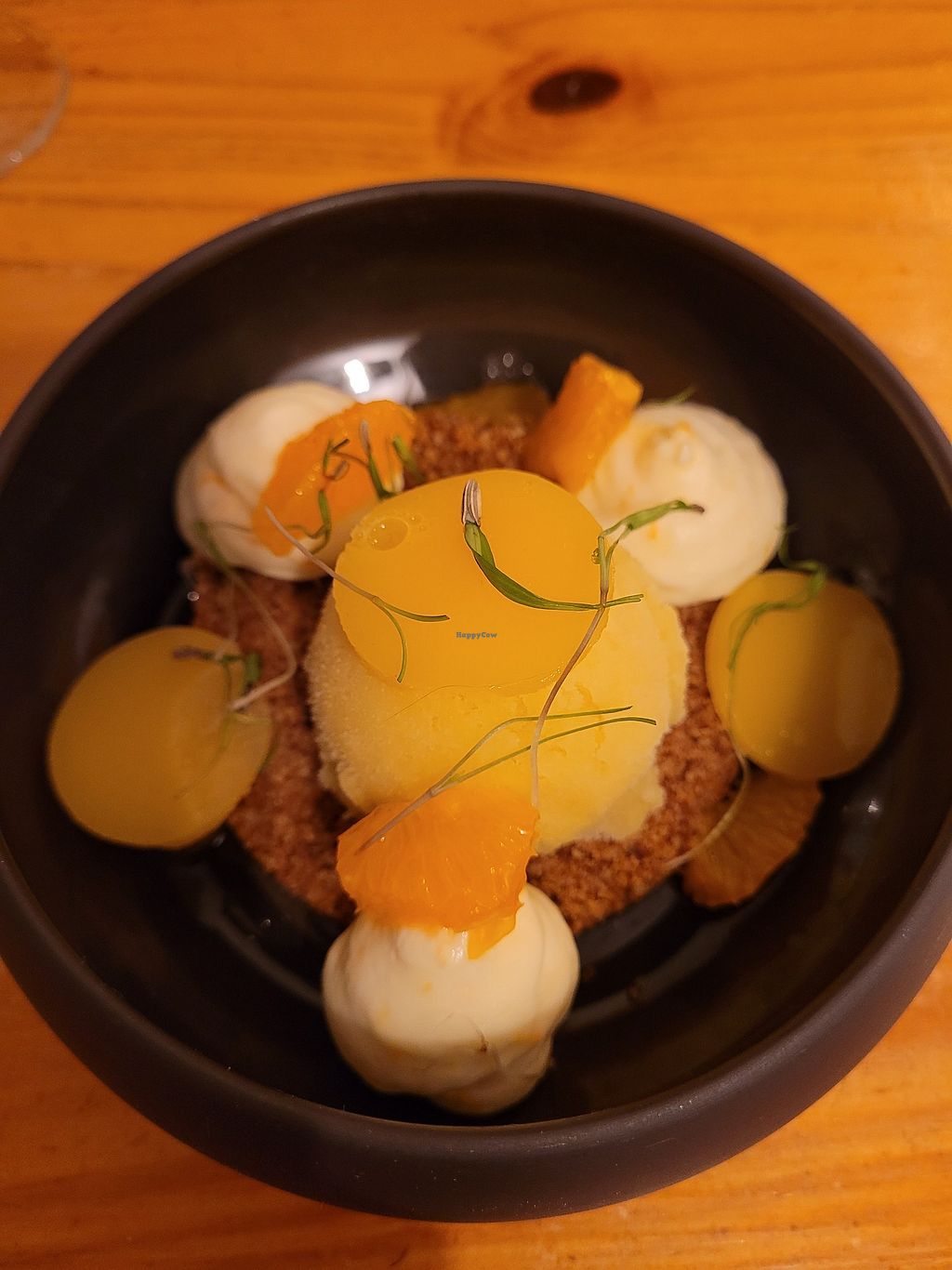Crème montée d'estragon sur lit de rhubarbe avec pistaches caramélisée…