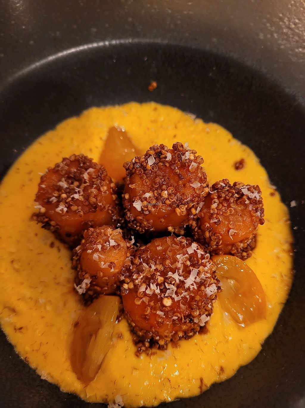 Mousseline de céleri rave au poivre de timing, rôti de seitan eu croût…