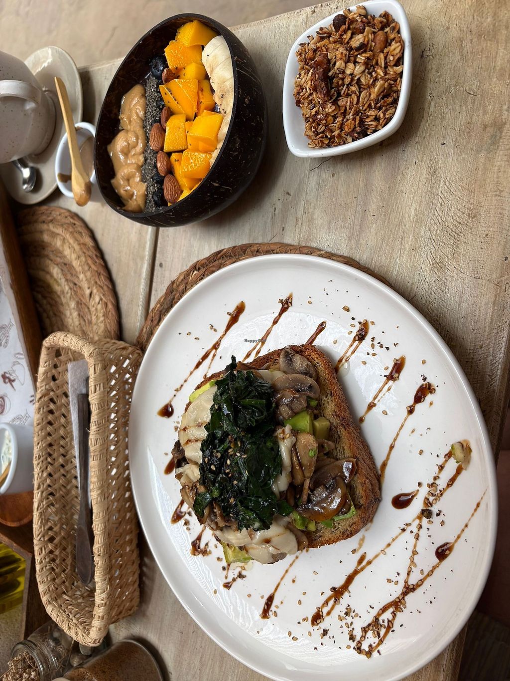 Mushrooms, avocado, spinach, vegan cheese on toast!