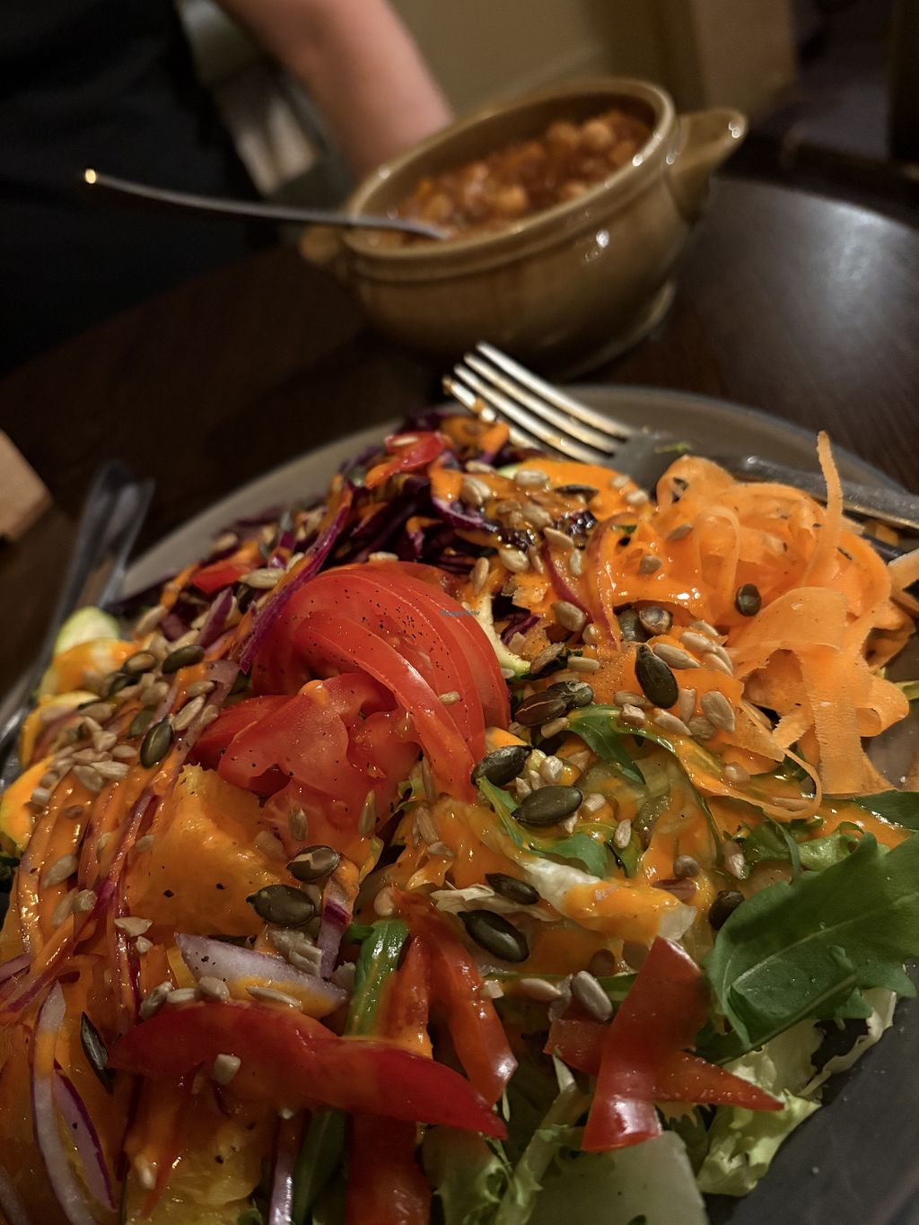 Quesadilla de hummus, queso vegano y boniato y plato del día (falafel)…