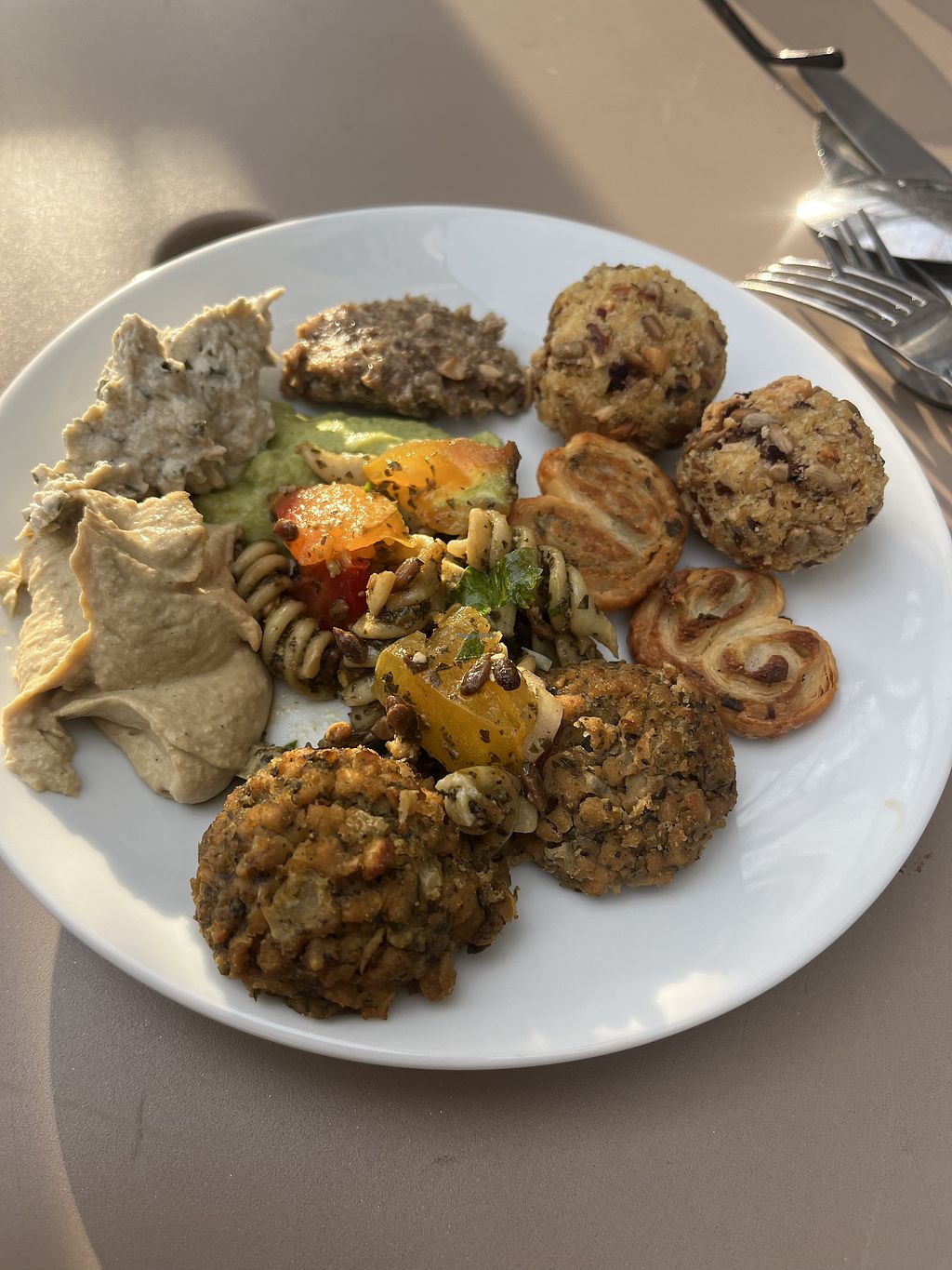 Piatto salato: salsicce veg, maionese veg, tofu strapazzato, bacon veg…