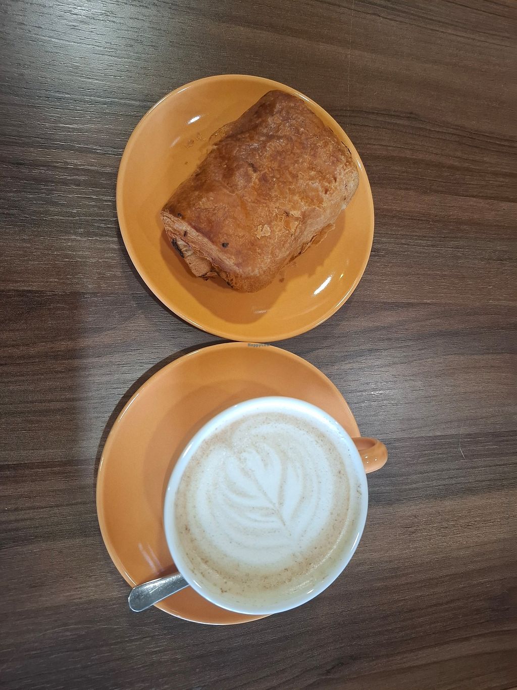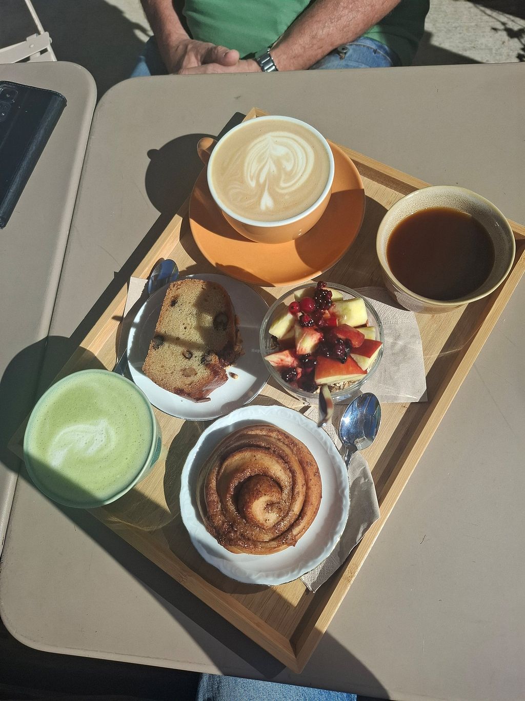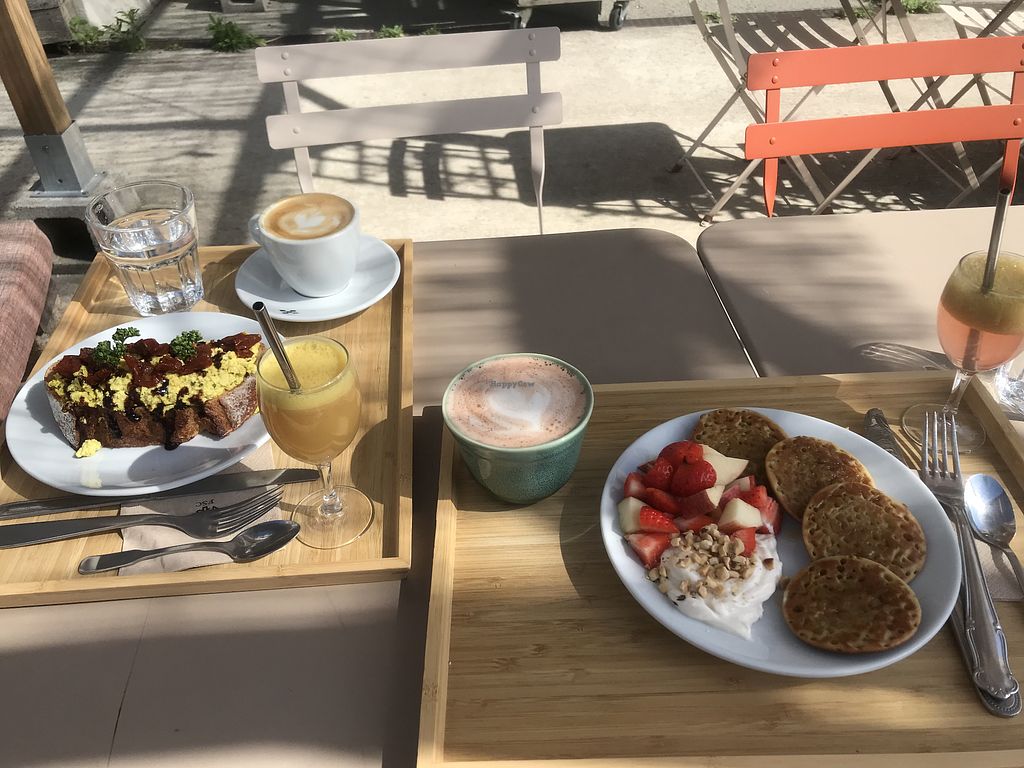 Pancakes & scrambled tofu toast with hot drink and fresh juice from br…