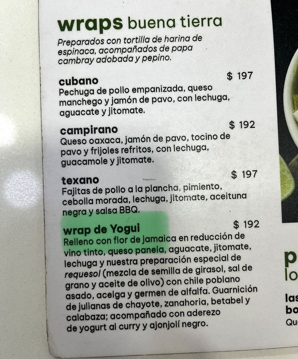 I always get the wrap de yogui without cheese. It’s a yummy veggie wrap. They also have vegan enchiladas that I’ve never tried. The only con is that it might be hard if you don’t speak any Spanish because the menu is not in English.