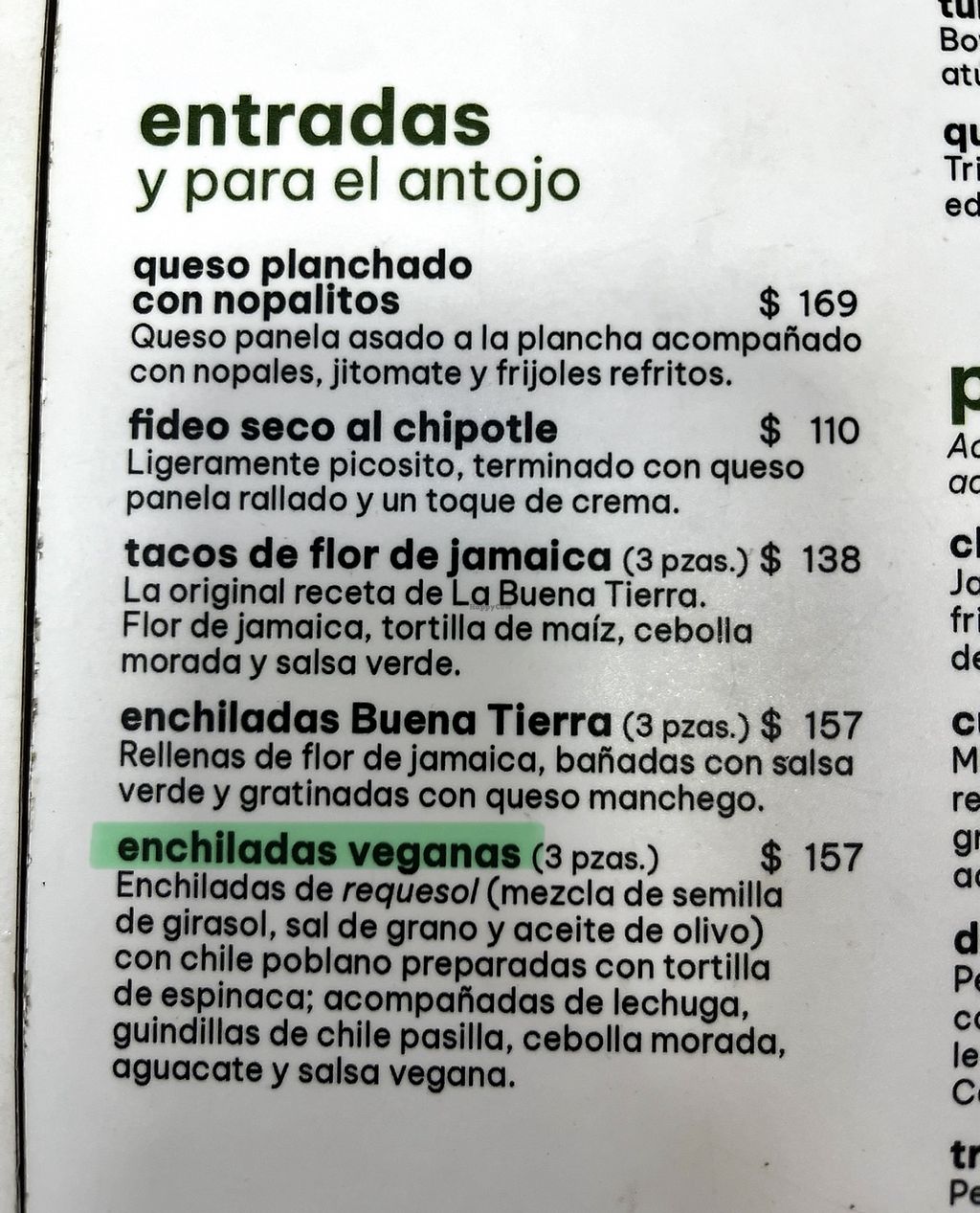 I had the enchiladas veganos twice here already. Cheap and good portion. They can also do other foods vegan I believe.