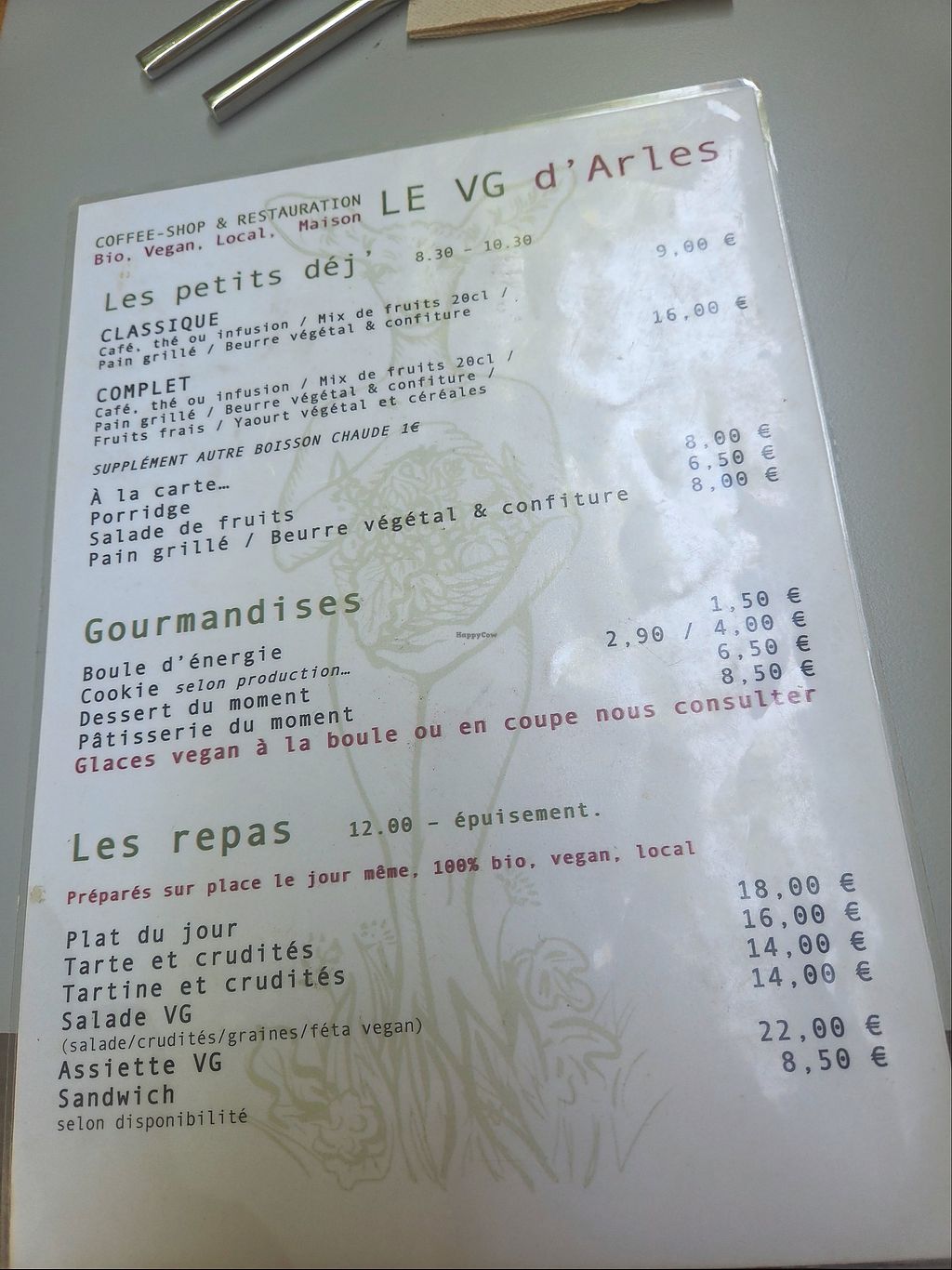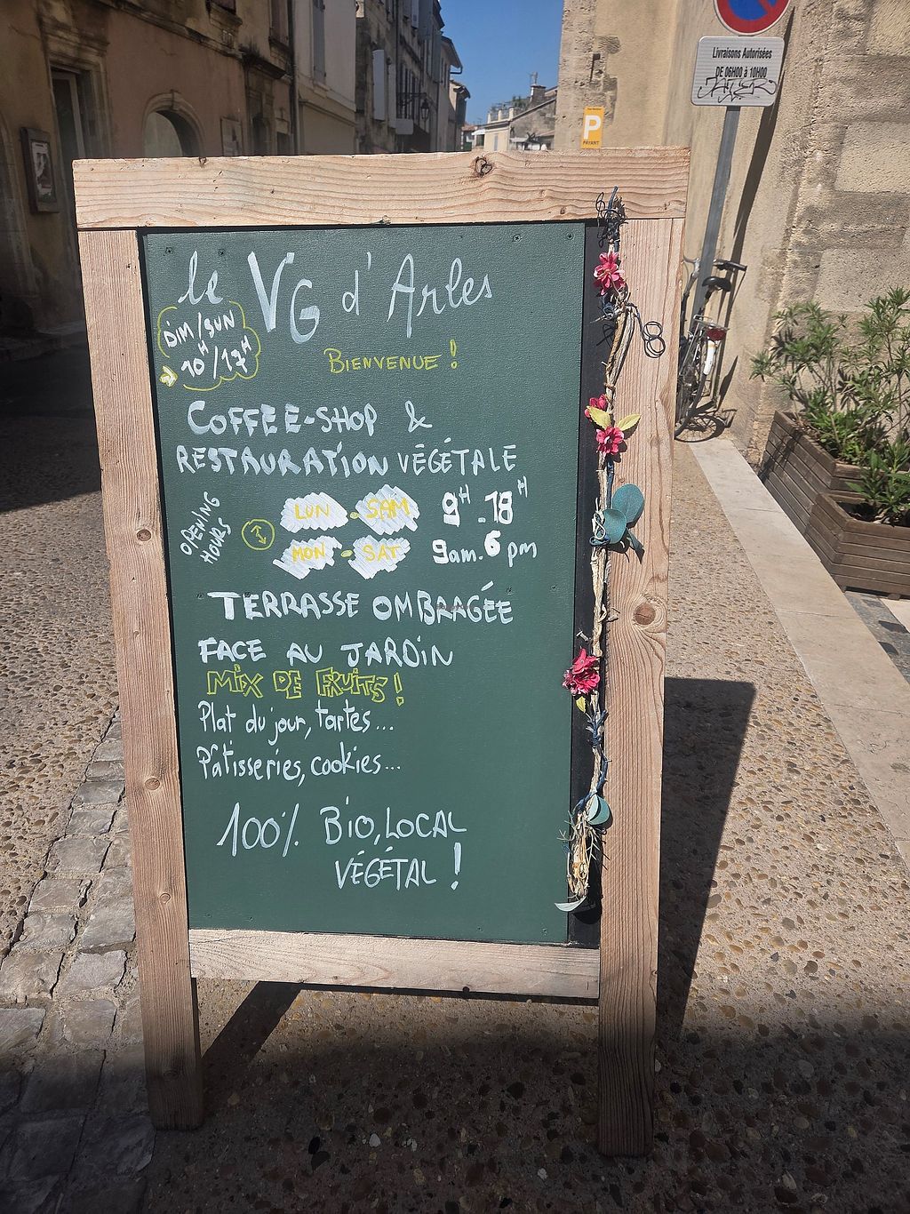 We stopped in Arles on May 20th, (a public holiday). There were staff working, doing some maintenance, at Le VG D’Arles and so we were informed that the restaurant was closed. When one of the owners realized that we were vegan and looking for a place to eat lunch, she offered that we could eat lunch as she had made some extra meals (even though the restaurant was closed m). Our lunch was excellent and the owners and staff are lovely generous people. You meet the most wonderful, beautiful people at vegan restaurant!