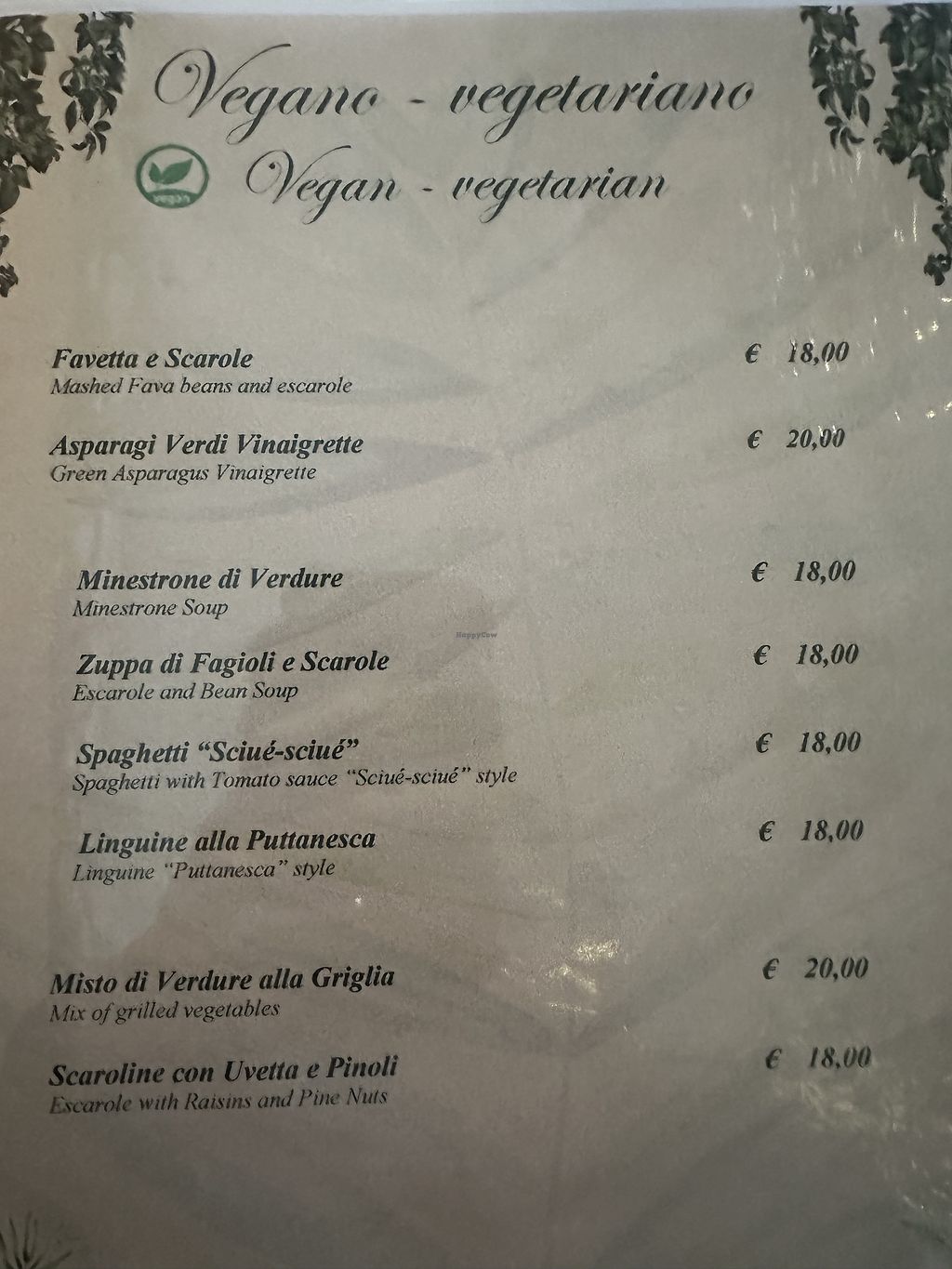 The staff were super friendly and could explain what options were vegan or could be veganised, such as pasta sciue sciue, puttanesca, bean soup, salads. No dedicated labels on the veggie and vegan menu but they talked us through each option. Gorgeous little restaurant in one of side streets off main Capri square, very friendly and buzzing feel to it and very good pasta.