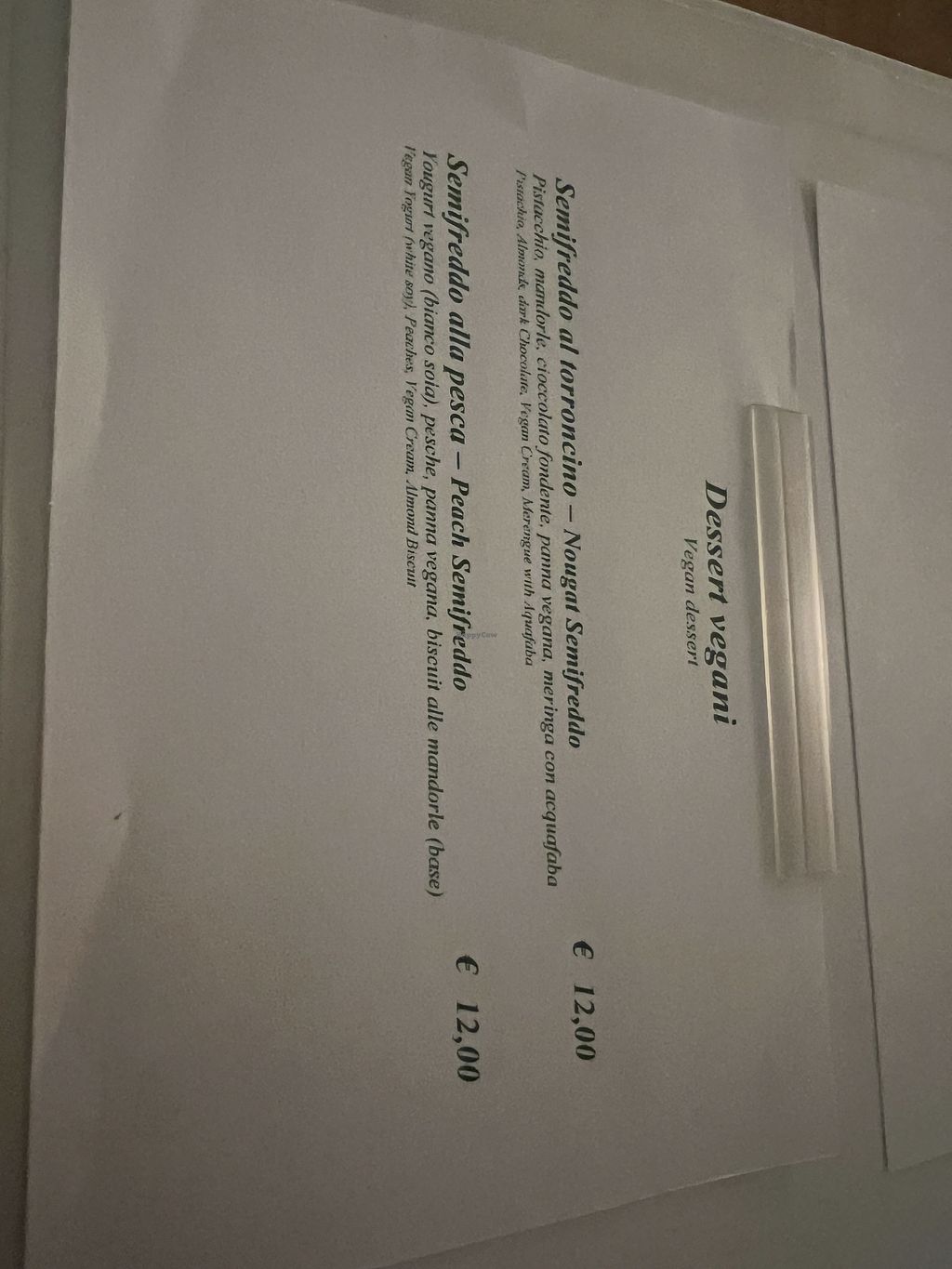 I highly recommend this restaurant! It has a separate vegan menu - many choices for starters and mains. The most unexpected part was the dessert menu- we had spectacular vegan semifreddos in the peach and chocolate flavours. Amazing place!!!