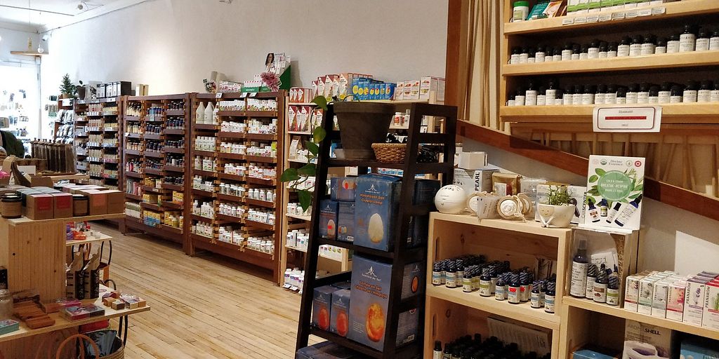 Large store which joins three separate rooms. Wide range of products, including fresh, organic produce, bulk bins (grains, beans, teas, flours, molasses, peanut butter, snacks), beers (and a shelf of non-alcoholic brands)/wines/ciders, nuts and seeds and lots more. Many vegan items, including cheeses, meats, frozen foods (Gardein brand, burgers, ice cream bars…). The third room offers personal care products, medicinal teas, homeopathic and flower remedies and supplements.