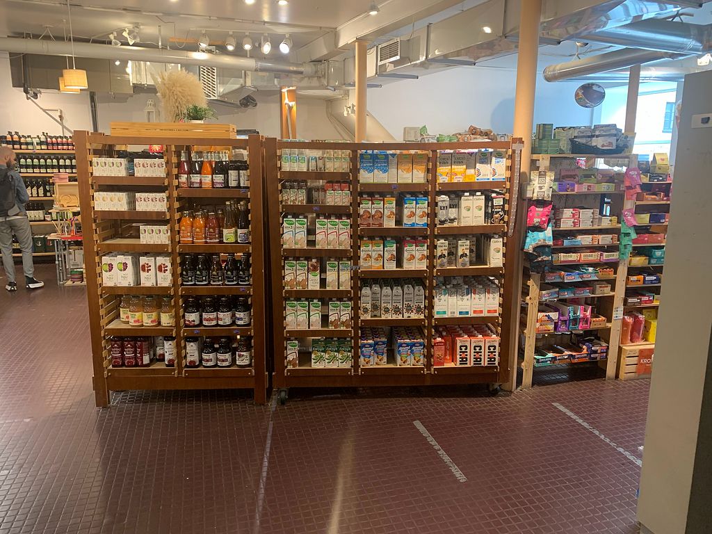 Perfect shop with lots of fresh food and fake meat. Great variety of choice. Also sells in house made meals. Also has a little corner where you can eat fresh food. Food corner closes at 7 pm, shop at 9 pm.