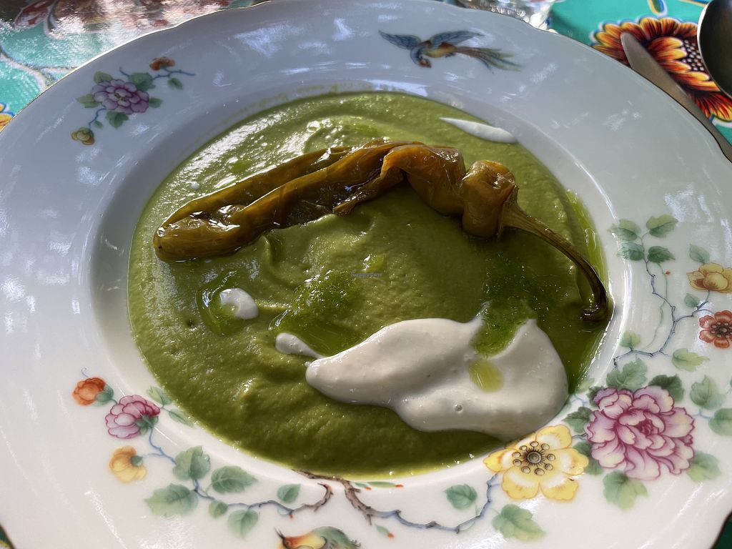 Gazpacho of peas and courgettes with baked friggitello, creme fraiche …