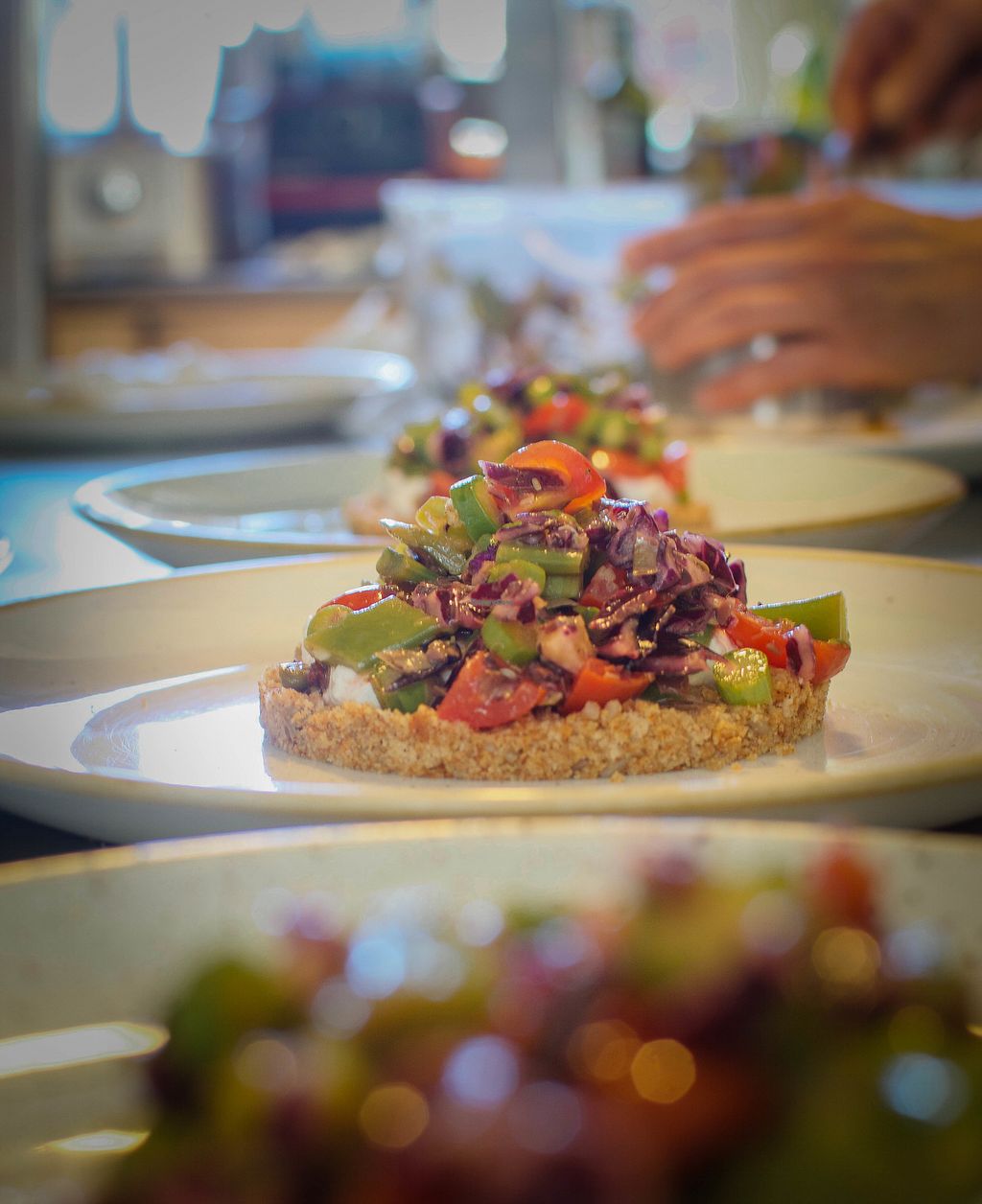 Chickpea cream with marinated vegetables and lentil wafers