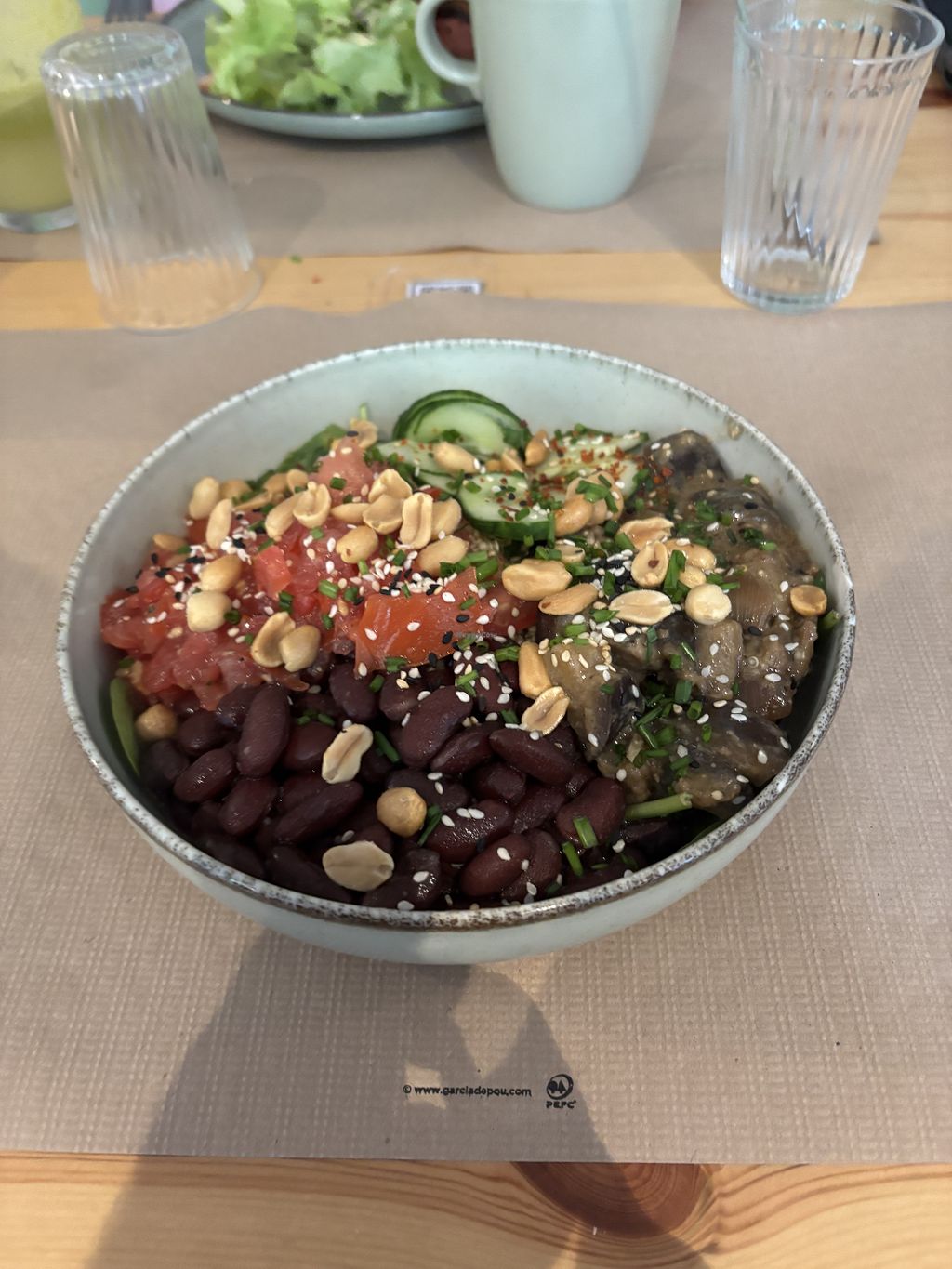 Le restaurant m'a peut être été survendu et mes attentes étaient peut être trop hautes mais le plat choisi (sur la carte un bol quinoa, aubergines rôties, haricots rouges à l'ail, pickles, salade, sauce wasabi) n'était pas à la hauteur de ce qui était annoncé : pas d'assaisonnement, la sauce au wasabi avait été oubliée et la moitié du bol contenait des aliments "bruts" (salade nature, concombre nature, haricots rouges cuits non assaisonnés, etc).