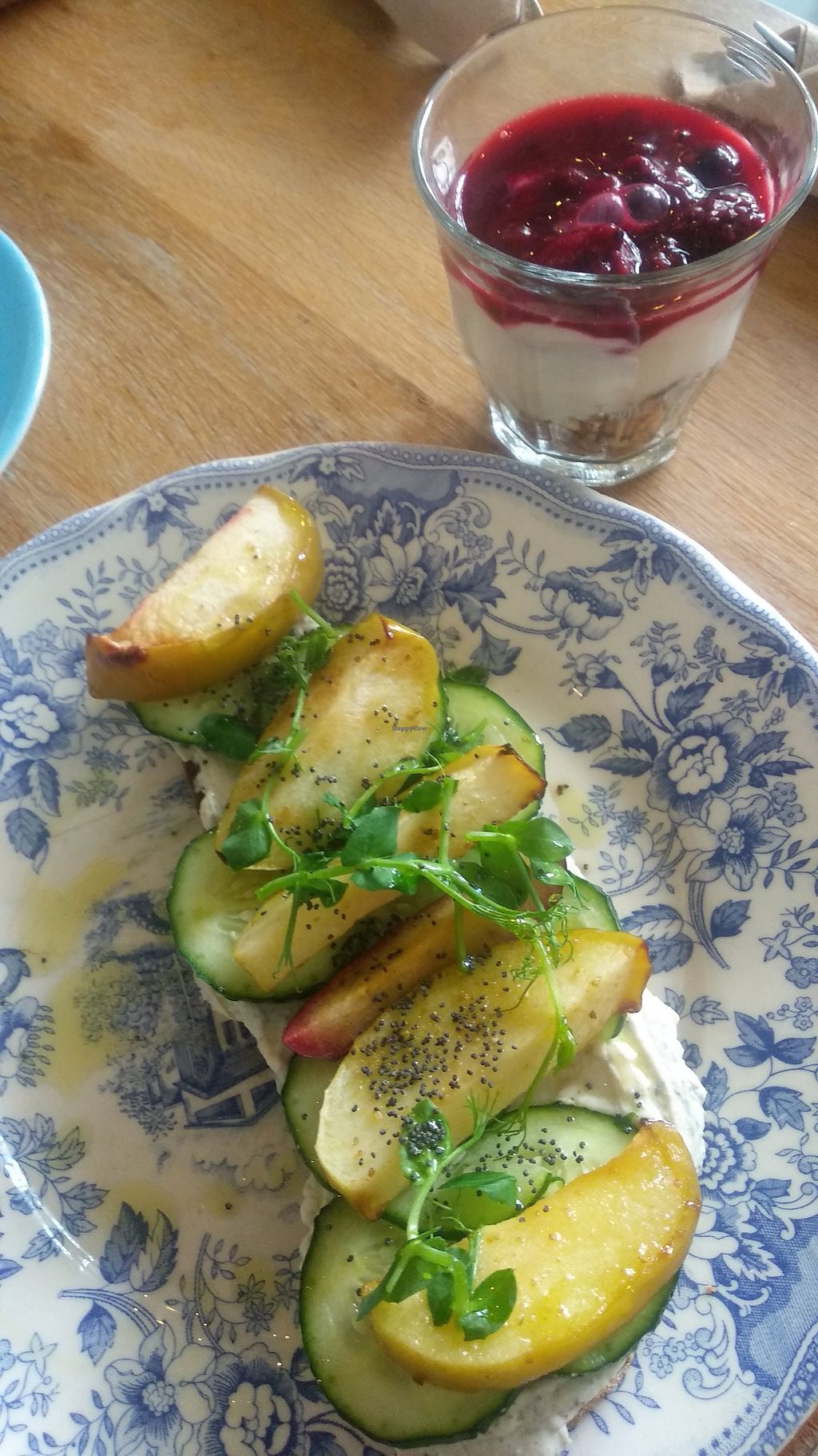 Tostada de Labneh con Pepino, Manzana Asada y Aceite de Hinojo