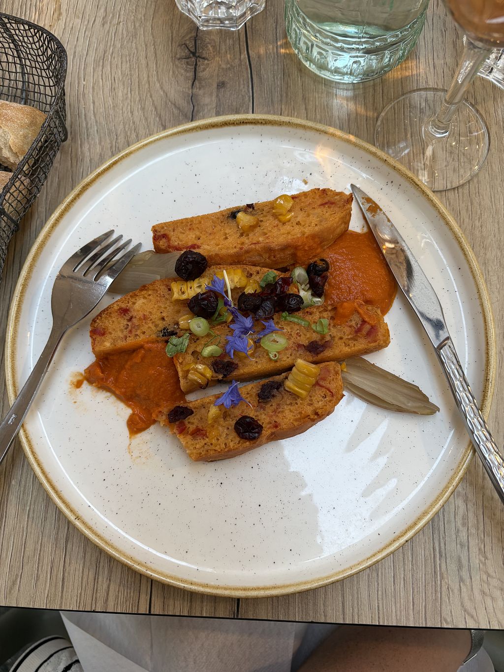 They have one vegan entre, main and dessert. You can do all three with the set menu or just select from a la carte. I had a cranberry cake for main - was slightly sweet but mostly savoury, quite good but nice to see all three options.